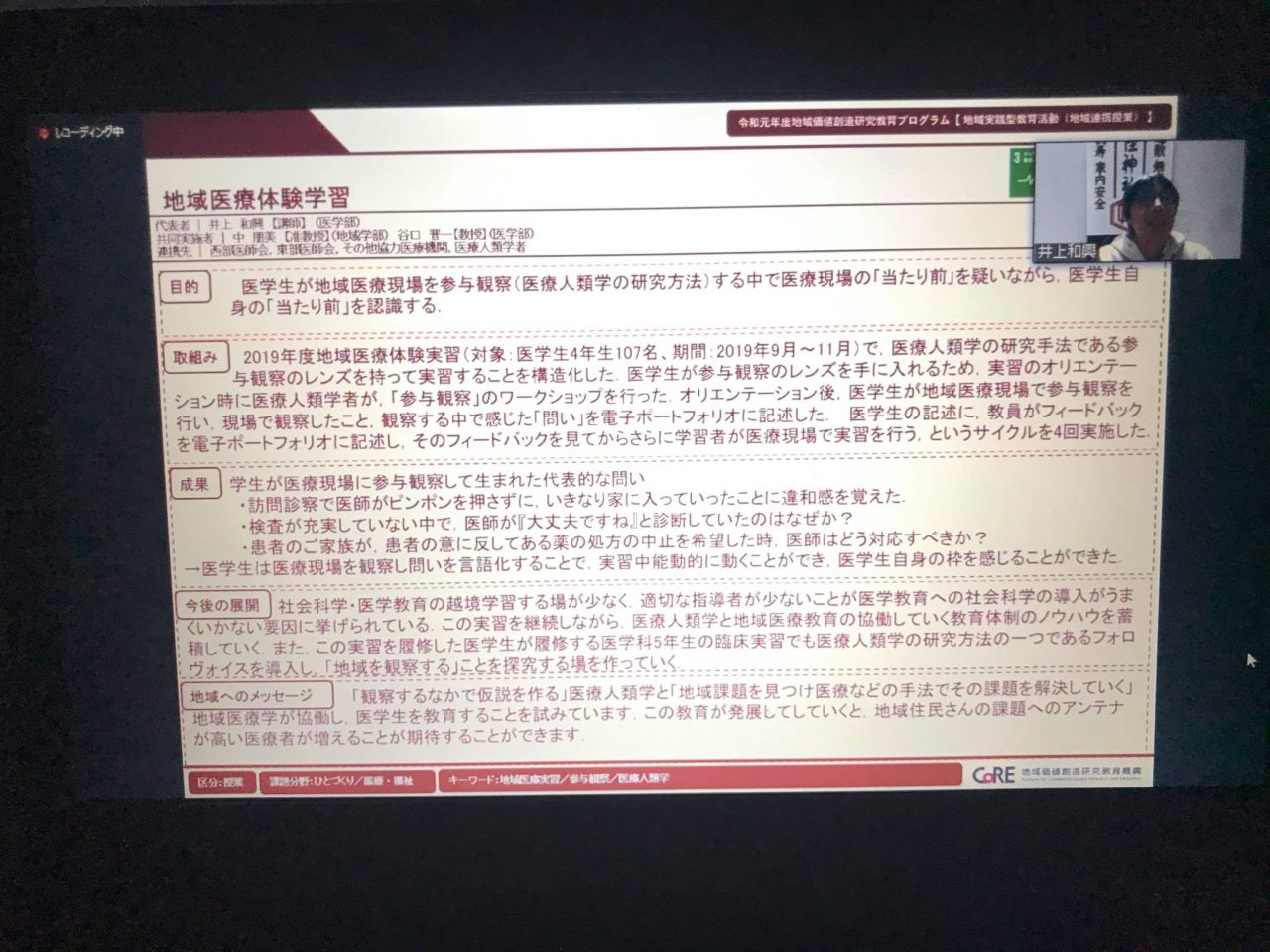 年末の話になりますが,2020年12月15日に鳥取大学ビジョン実現のための「戦略3 人口希薄化地域における地域創生を目指した実践型教育研究の新展開」報告会で,当教室の紙本先生と井上がプレゼンテーションをさせていただきました.紙本先生は,鳥取県日野町黒坂地区で行っている多職種連携教育についてお伝えしました.井上は医学科4年生に文化人類学者の先生方と協働で教育を構築していっている地域医療体験実習についてお伝えしました.どちらも内容も,地域医療教育を行いつつ地域創生にも貢献できるようなものとなっていて,今後も発展的に教育を行っていこうと考えおります.これからも,楽しみつつ地域医療教育に取り組んでいきたいと思いますので,よろしくお願いします!(井上)