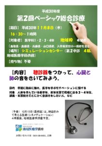 | ベーシック総合診療コース | ★11月8日(木)、4時限後に1時間程度、第2回を開催します。 場所は地域医療学講座斜め前にある「シミュレーションセンター」です。(第2中央診療棟4F) 第2回の内容は、「聴診器をつかって、心臓と肺の音をきいてみよう」です。 希望者以外でも飛び入り参加OKです! ※【予告】第3回(最終回)は12月13日(木)、「映画をみて考える医療(シネメデュケーション)」。 4時限後、地域医療学講座にて予定しています。 |