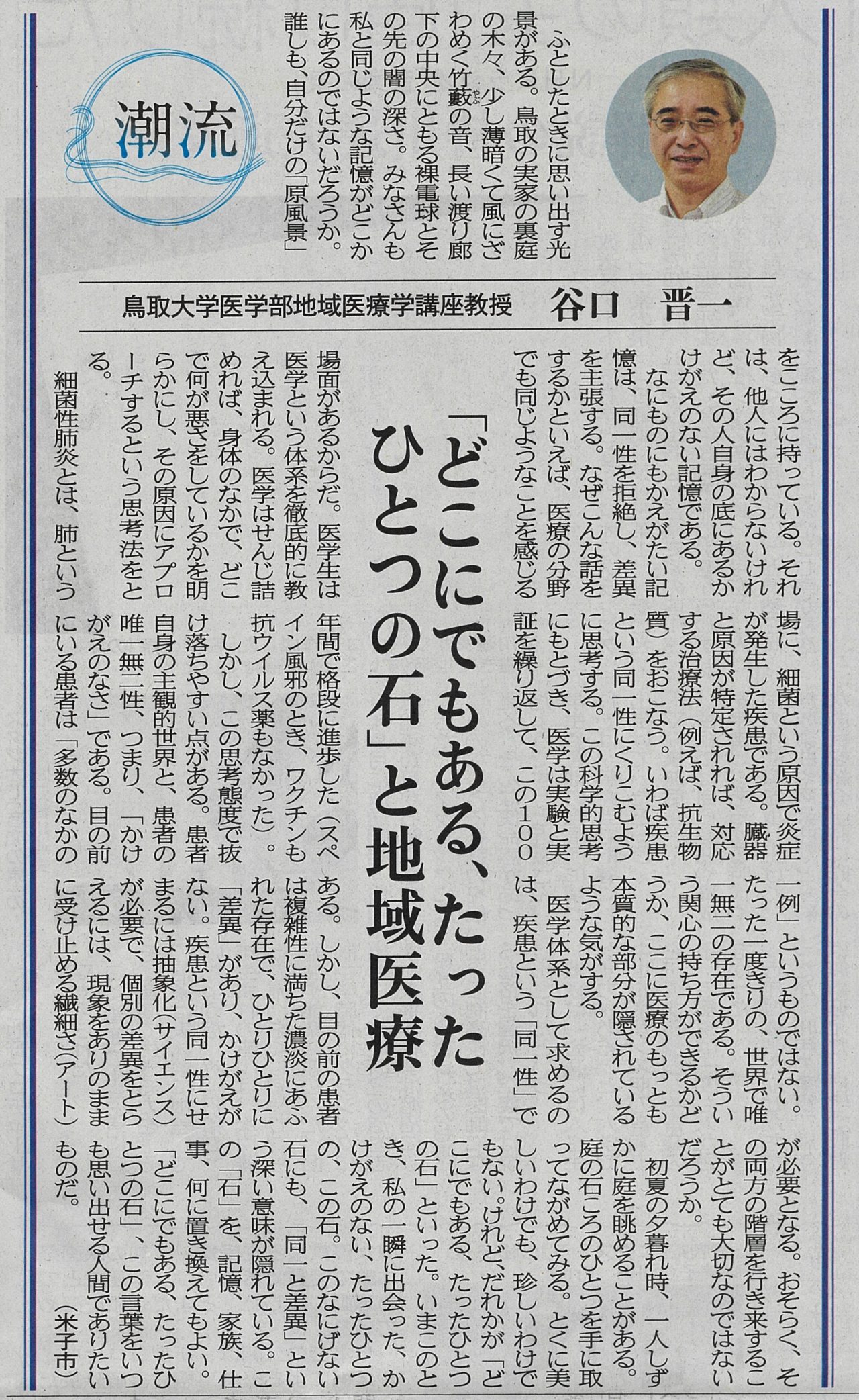 96月 2020 【日本海新聞】潮流 「どこにでもある、たったひとつの石」と地域医療 2020年6月9日の日本海新聞10面 潮流に掲載されました。 「どこにでもある、たったひとつの石」と地域医療 谷口 晋一 BY tottori-idai-main 0
