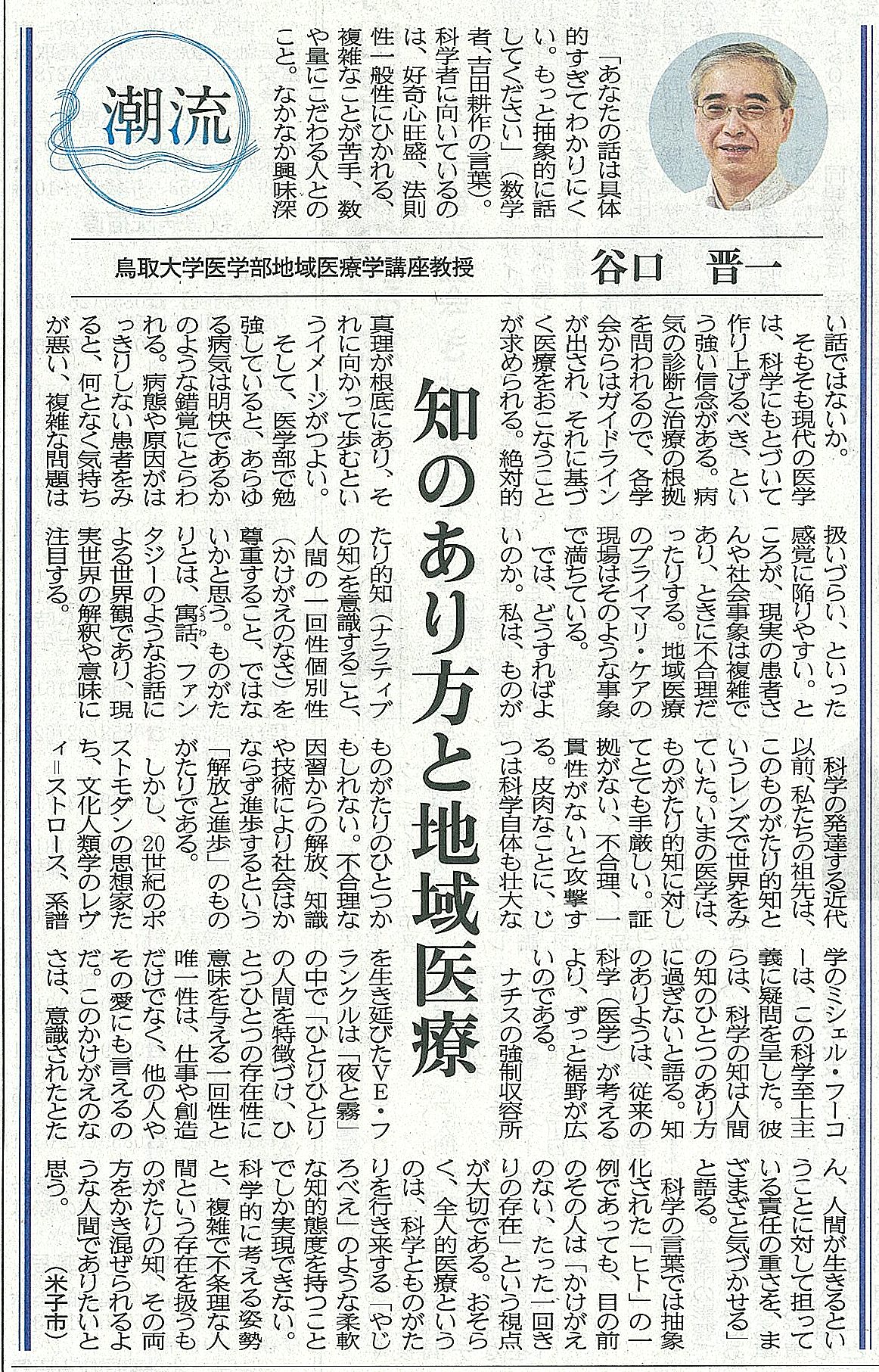 248月 2018 【日本海新聞】潮流 「知のあり方と地域医療」 2018年8月23日の日本海新聞 潮流に掲載されました。 「知のあり方と地域医療」 谷口晋一 BY tottori-idai-main 0