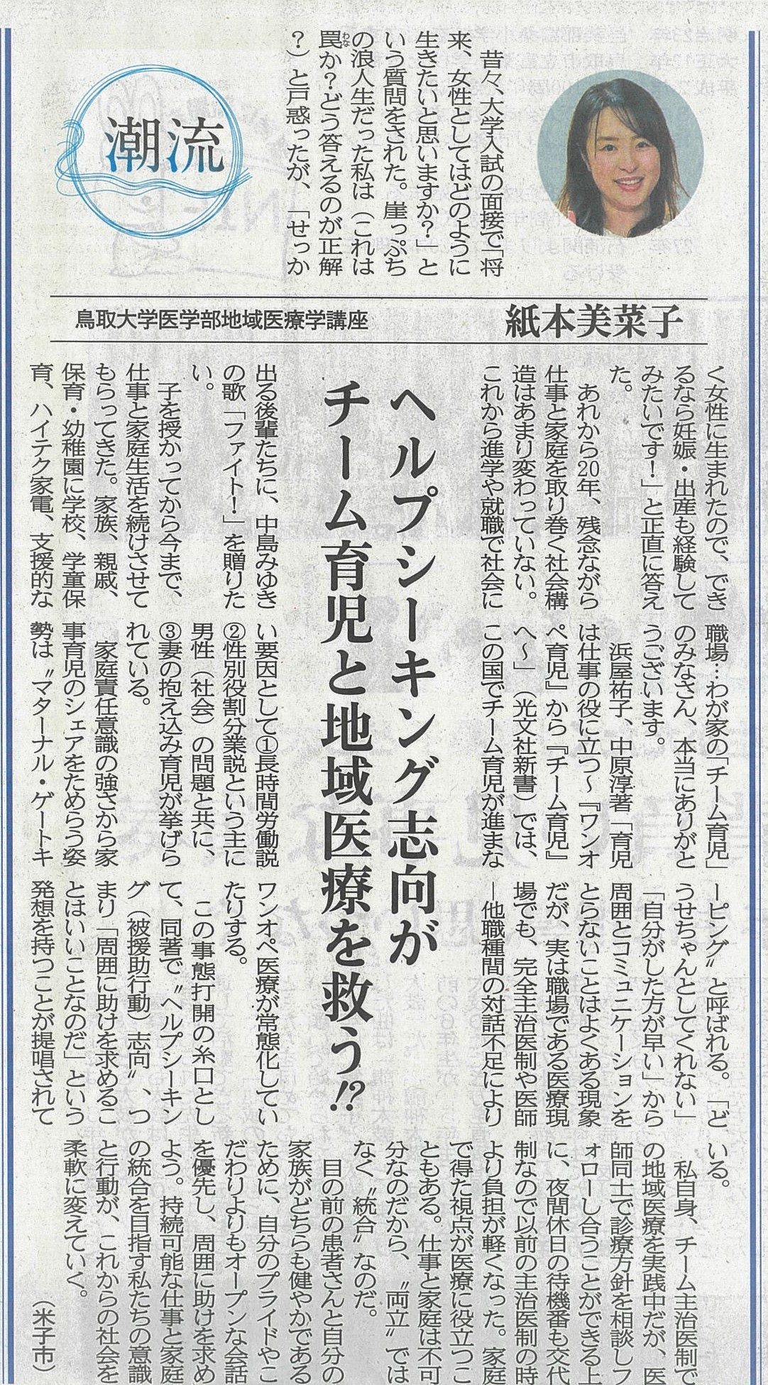 142月 2020 【日本海新聞】潮流 ヘルプシーキング志向がチーム育児と地域医療を救う⁉ 2020年2月14日の日本海新聞17面 潮流に掲載されました。 ヘルプシーキング志向がチーム育児と地域医療を救う⁉ 紙本美菜子 BY tottori-idai-main 0