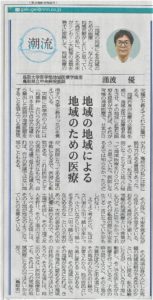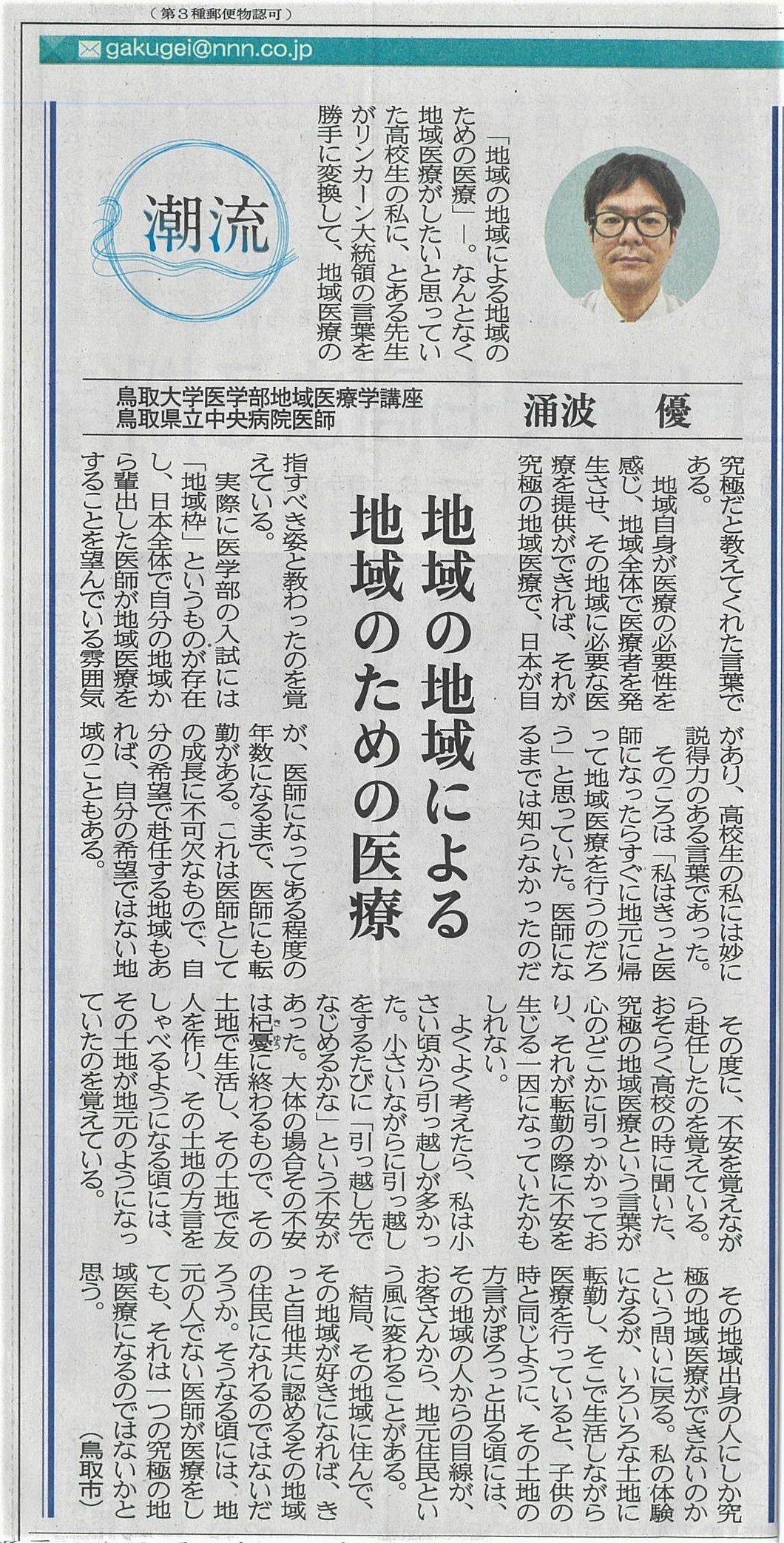 147月 2021 【日本海新聞】潮流 地域の地域による地域のための医療 2021年7月13日の日本海新聞10面 潮流に掲載されました。 地域の地域による地域のための医療 涌波 優 BY tottori-idai-main 0