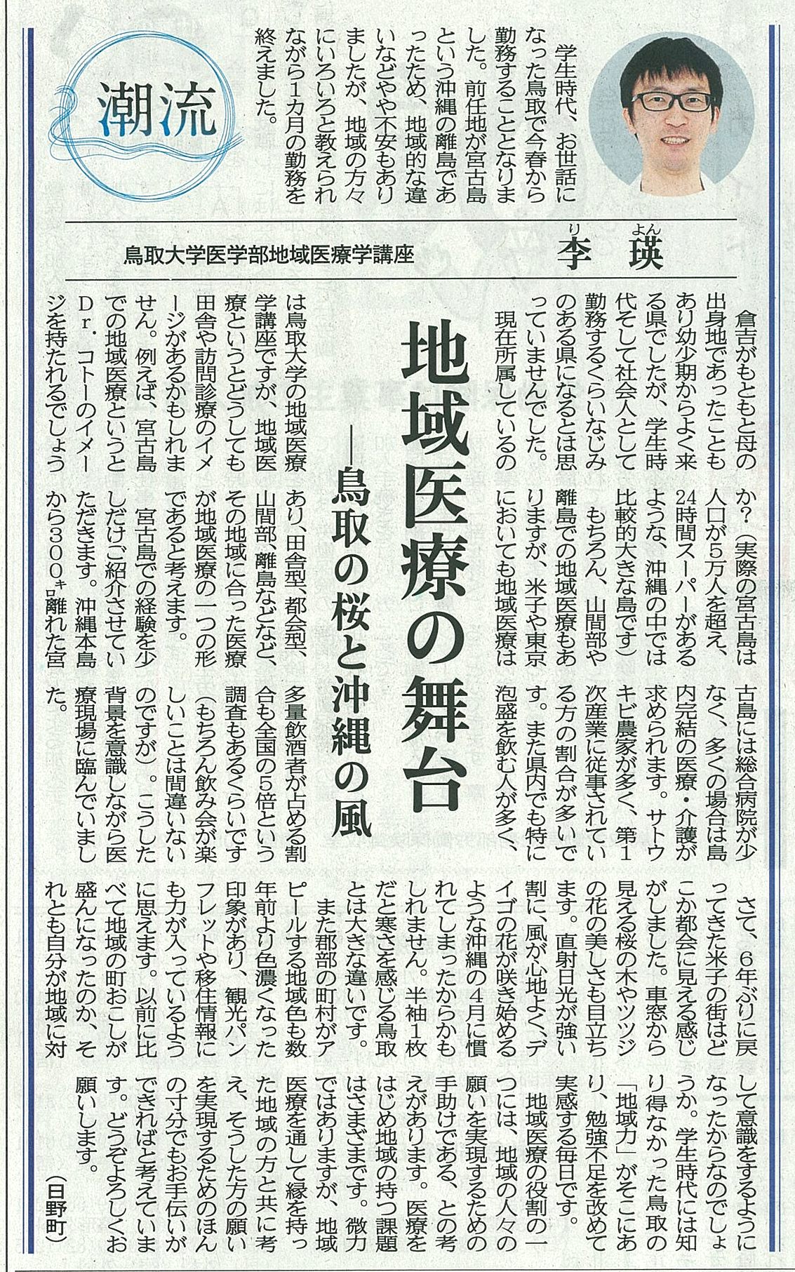 136月 2018 【日本海新聞】潮流 地域医療の舞台—鳥取の桜と沖縄の風 2018年5月19日の日本海新聞 潮流に掲載されました。 地域医療の舞台—鳥取の桜と沖縄の風 (李瑛) BY tottori-idai-main 0