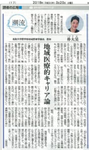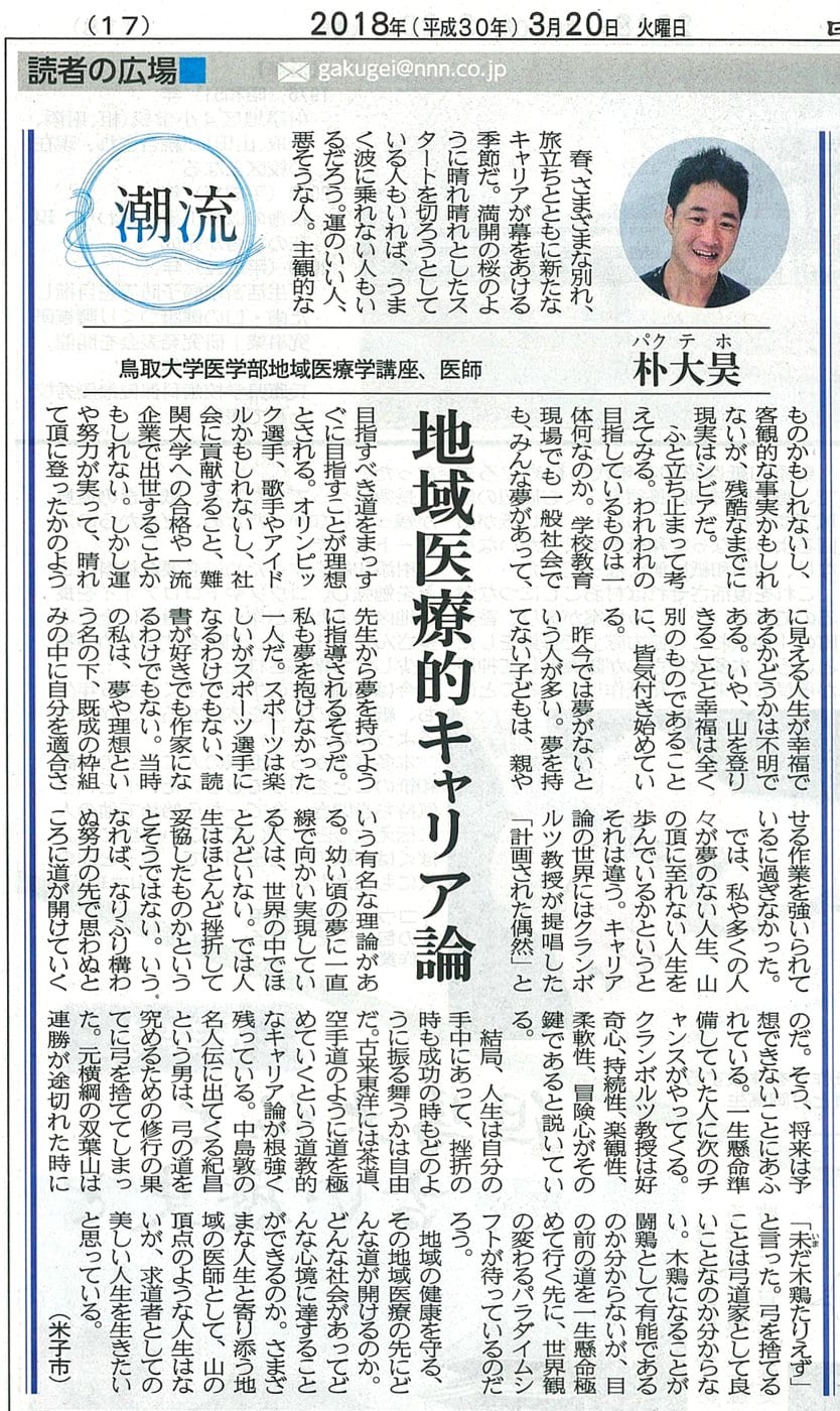 203月 2018 【日本海新聞】潮流 地域医療的キャリア論(20180320) 2018年3月20日の日本海新聞17面 潮流に掲載されました。 地域医療的キャリア論 朴 大昊 BY tottori-idai-main 0