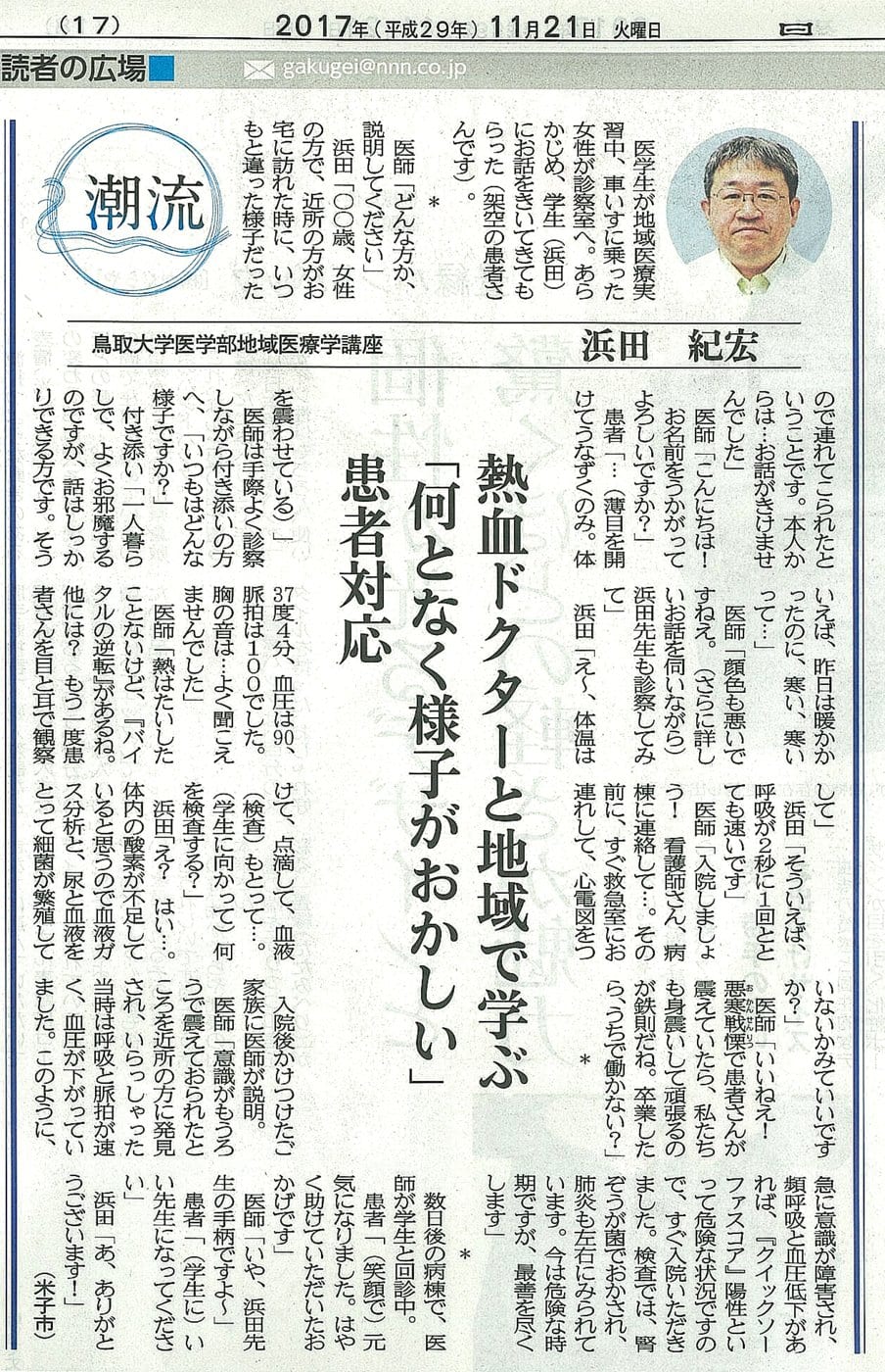 2211月 2017 【日本海新聞】潮流 熱血ドクターと地域で学ぶ「何となく様子がおかしい」患者対応 (20171121) 日本海新聞 2017年11月21日の潮流に掲載されました。 『熱血ドクターと地域で学ぶ「何となく様子がおかしい」患者対応』 浜田 紀宏 BY tottori-idai-main 0