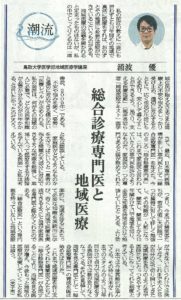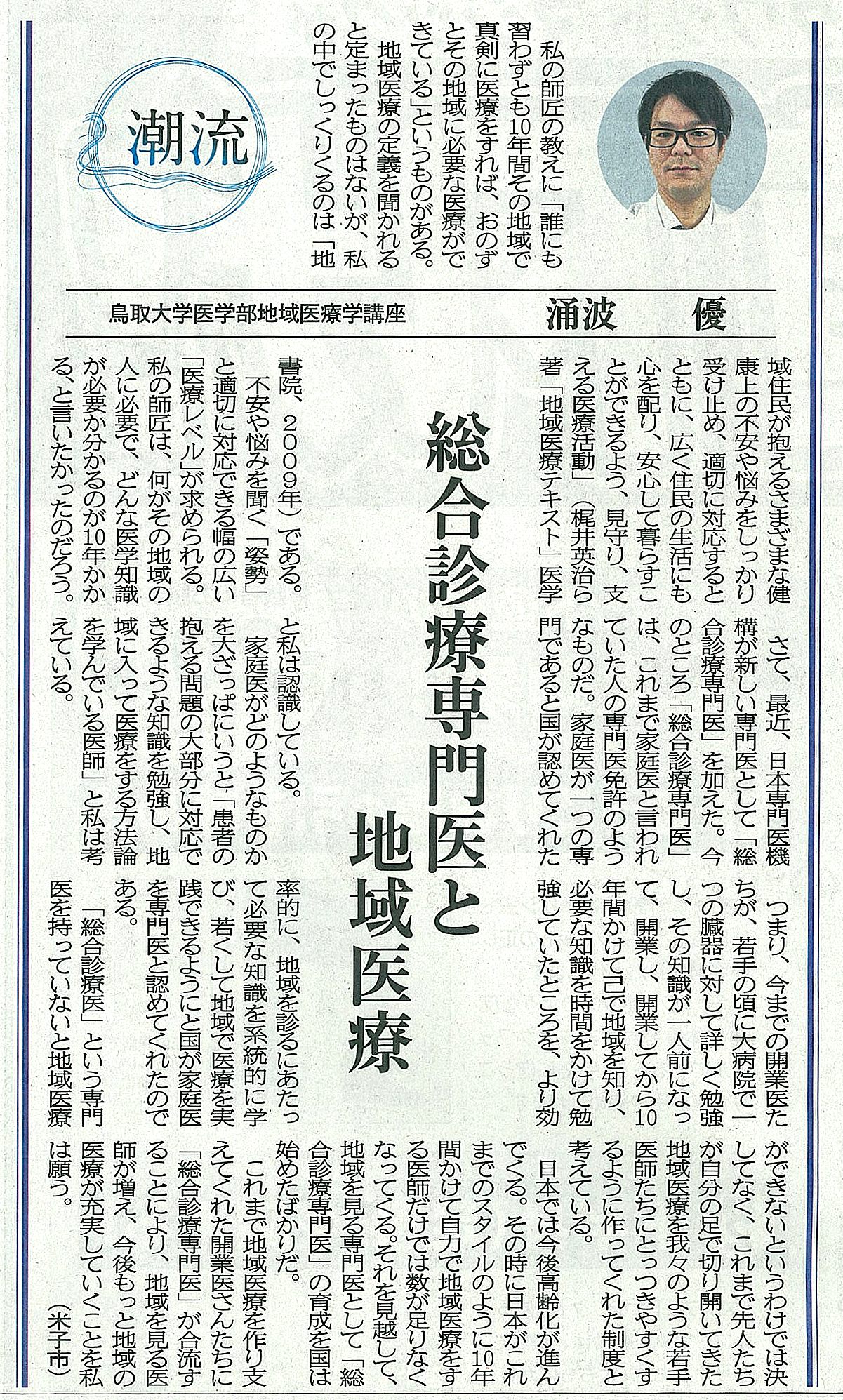 136月 2019 【日本海新聞】潮流 総合診療専門医と地域医療 2019年6月13日の日本海新聞17面 潮流に掲載されました。 総合診療専門医と地域医療 涌波 優 BY tottori-idai-main 0