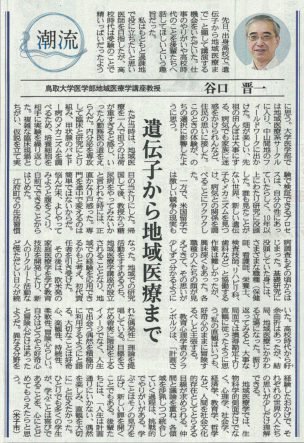 266月 2018 【日本海新聞】潮流 遺伝子から地域医療まで 2018年6月23日の日本海新聞 潮流に掲載されました。 遺伝子から地域医療まで 谷口 晋一 BY tottori-idai-main 0