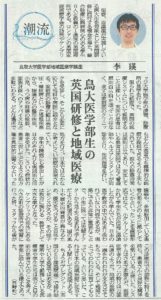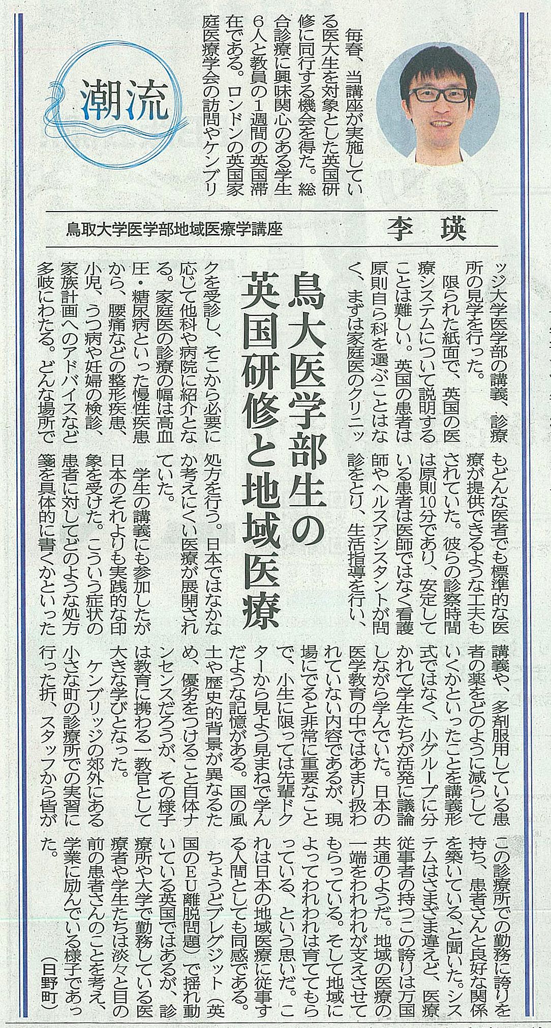 124月 2019 【日本海新聞】潮流 鳥大医学部生の英国研修と地域医療 2019年4月12日の日本海新聞17面 潮流に掲載されました。 鳥大医学部生の英国研修と地域医療 李 瑛 BY tottori-idai-main 0