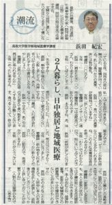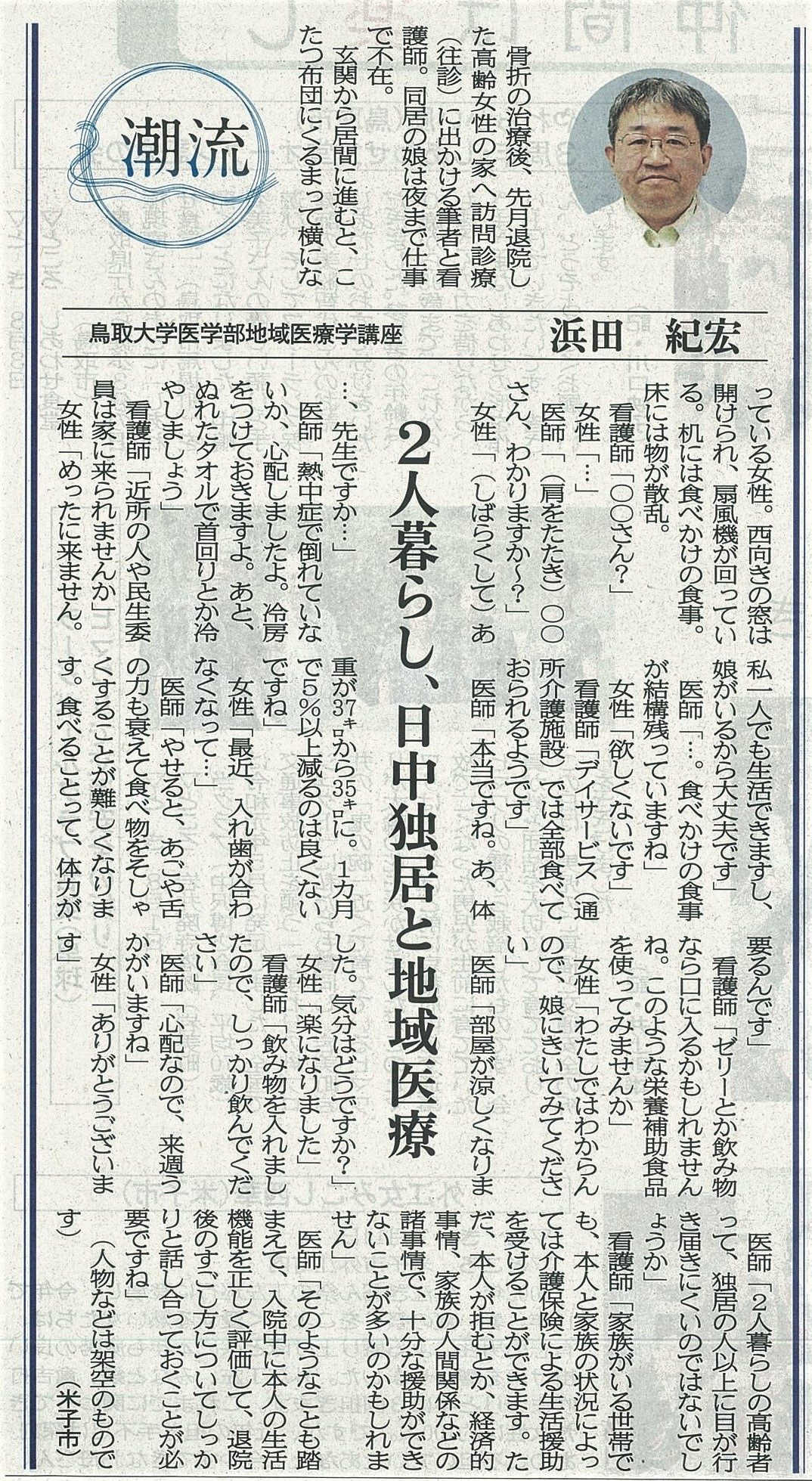 308月 2019 【日本海新聞】潮流 2人暮らし、日中独居と地域医療 2019年8月23日の日本海新聞9面 潮流に掲載されました。 2人暮らし、日中独居と地域医療 濵田 紀宏 BY tottori-idai-main 0