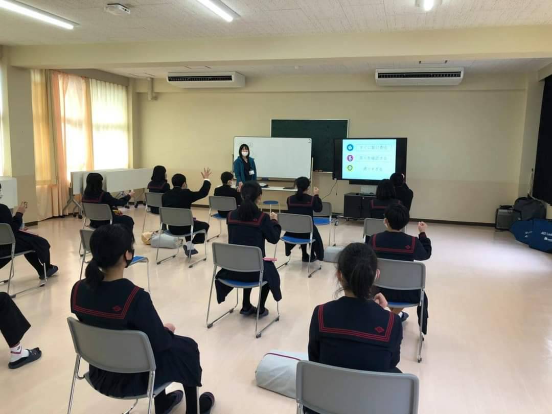 2月8日、“いのちの授業”の一環として、日野中学校2年生の皆さんに救命処置についてお話しました。