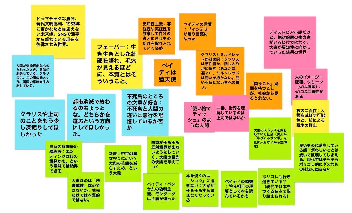 大衆が、権力によって監視されるディストピア小説とは違い、大衆自体が反知性主義へと向かっていくというのがこの小説の特徴ではないか、そして、それが現代と酷似しているという感想が多く出ました。