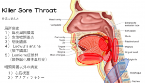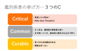 自己紹介やコースの紹介などに引き続いて、咽頭痛の基礎的なレクチャーと模擬診察を行いました。