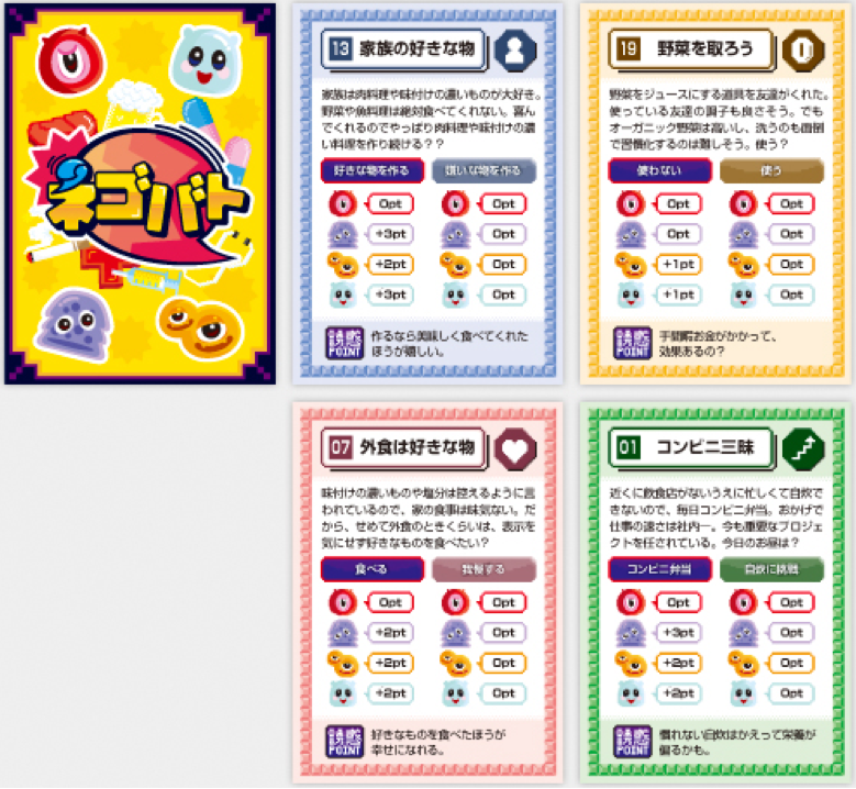 ネゴバト(ネゴシエーションバトル)はカードゲームを使って日常行動と生活習慣病との関係性を学習できるシミュレーションゲームです。