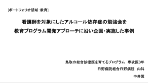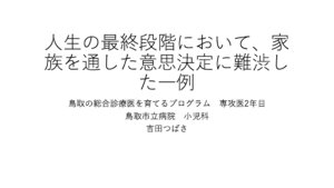 このたび『人生の最終段階において、家族を通した意思決定に難渋した一例』のポートフォリオを発表し、優秀賞をいただきました。初めて書いたポートフォリオで、右も左も分からず、指導医の先生方に手取り足取り教えていただきながら何とか形にしたものでした。そのため、受賞に一番驚いたのは私だと思いますし、今でも信じられません(笑)。一方で、症例自体は短期間の経験でしたが、主治医を務める中で板挟みになったため、そのときの苦労が報われたような気がしています。