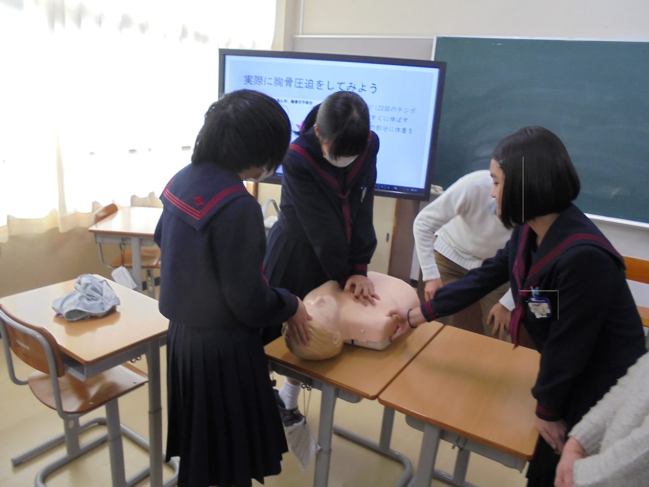 先々週に引き続き、先週も日野中学校でいのちの授業をおこなってきました。今回は、傷害の対応、というテーマで打撲や汚染創への対応をお話したあと、メインテーマとして心肺停止の人への対応、についてお話をしました。心肺停止した人を見つけたときに、胸骨圧迫(心臓マッサージ)をする重要性を説明した後、人形を使って実際に生徒さんに胸骨圧迫を体験してもらいました。1人1分と短い時間でしたが、胸骨圧迫を継続することの大変さを実感してもらいました。またAEDも実際に触ってもらいながら手順を確認しました。