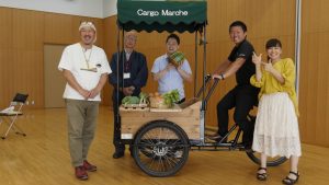 竹口町長、民生委員の山本さん、倉吉で地元野菜の屋台訪問販売を行う