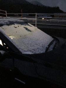 大山は春の嵐。4月ですが、仕事終わりに診療所を出るときには車に雪が積もっていました。