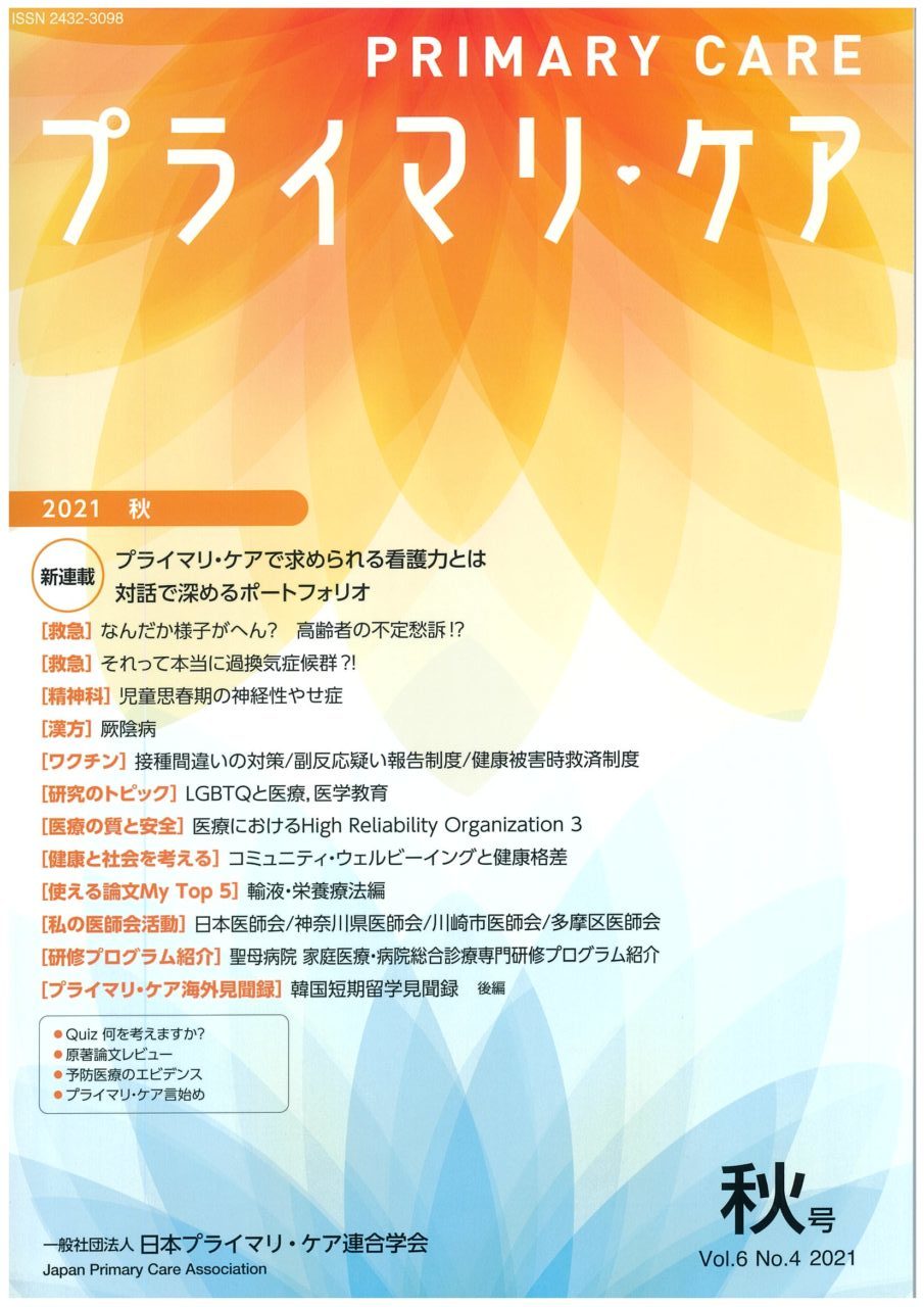 1110月 2021 孫先生の論文が【プライマリ・ケア2021秋号】に掲載されました プライマリ・ケア秋号 Vol.6 No4 2021 に掲載されました。 【健康と社会を考える】 コミュニティ・ウェルビーイングと健康格差 地域医療学講座図書館の置いてありますので、ご覧になりたい方はお気軽にお越しください。 BY tottori-idai-main 0