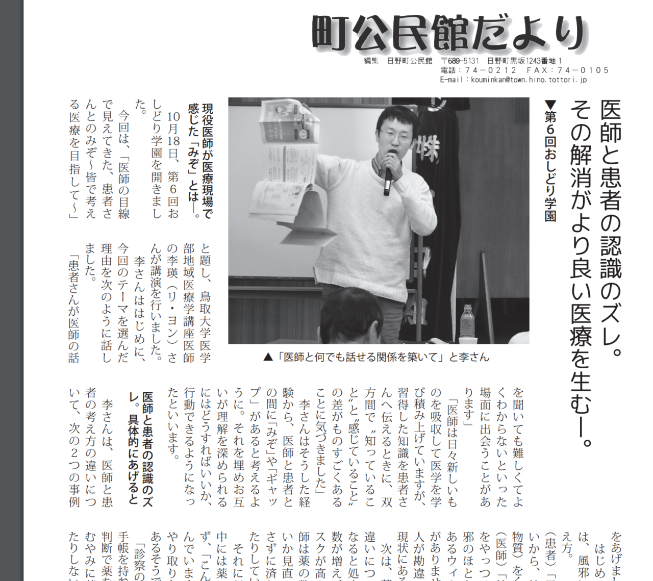 2612月 2019 広報ひのに取り上げられました 10月に行った生涯学習の場での教室員の講演会の様子が地元広報誌・広報ひの12月号に取り上げられました。「風邪への抗菌薬」や「ポリファーマシー」「かかりつけ医をもつこと」についてお話をさせていただきました。受講生の皆様の健康観に少しでも役立てれば幸いです。 リンク先から全文は読めますので、興味ある方はどうぞ読んでみてください(22ページです)。 https://www.town.hino.tottori.jp/item/37798.htm#itemid37798 BY tottori-idai-main 0