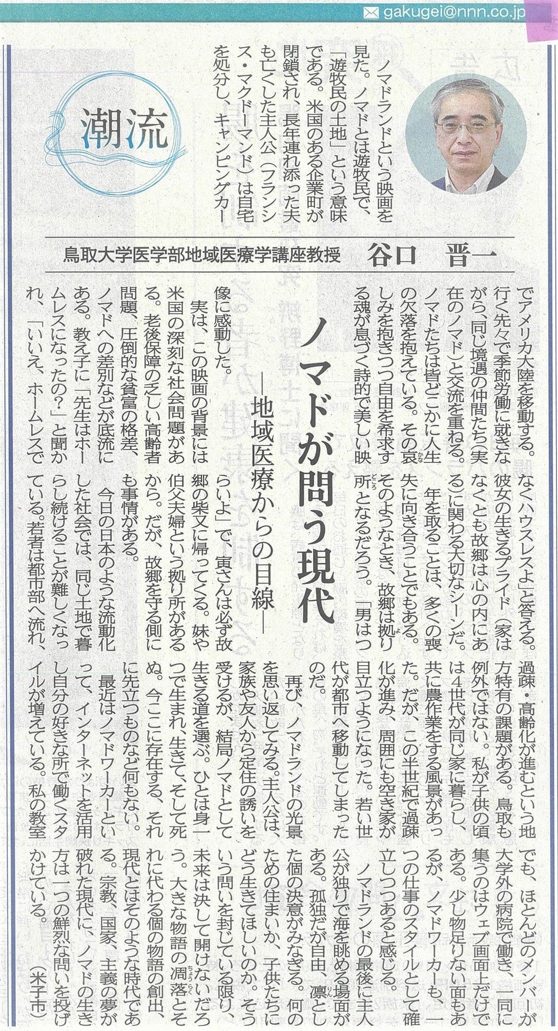 208月 2022 日本海新聞【潮流】に掲載されました 2022年8月18日 日本海新聞9面 潮流に掲載されました。 「ノマドが問う現代」-地域医療からの目線- BY tottori-idai-main 0