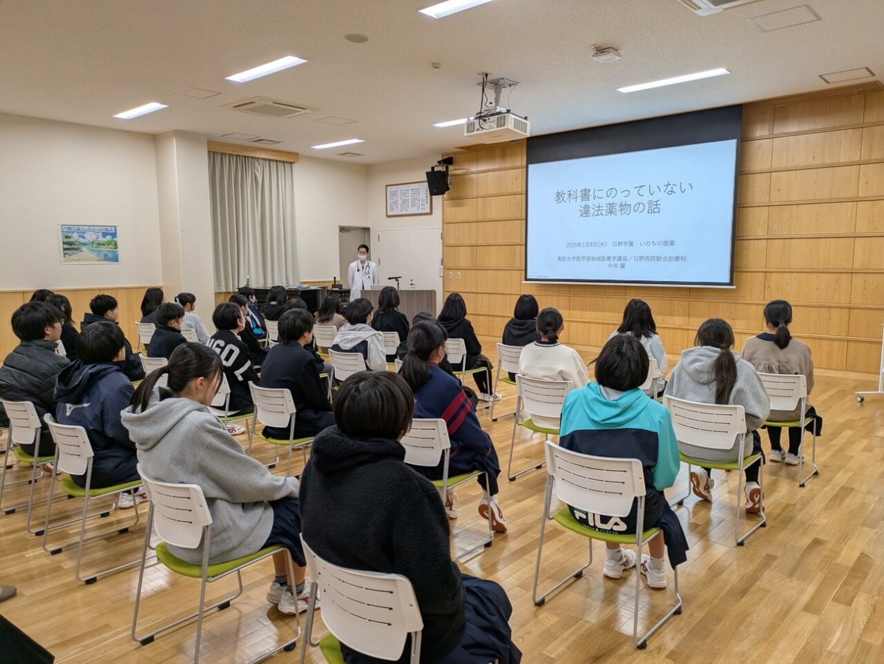 令和7年1月8日、日野学園6〜9年生の45名と教職員対象に「教科書にのっていない違法薬物の話」の授業を行いました。