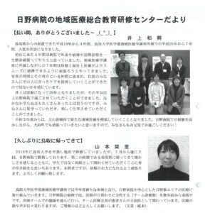 285月 2021 日野病院組合だより せせらぎNO.71に掲載されました 日野病院組合だより せせらぎNo.71 「日野病院の地域医療総合教育研修センターだより」 井上先生と山本先生のご挨拶が掲載されました! BY tottori-idai-main 0