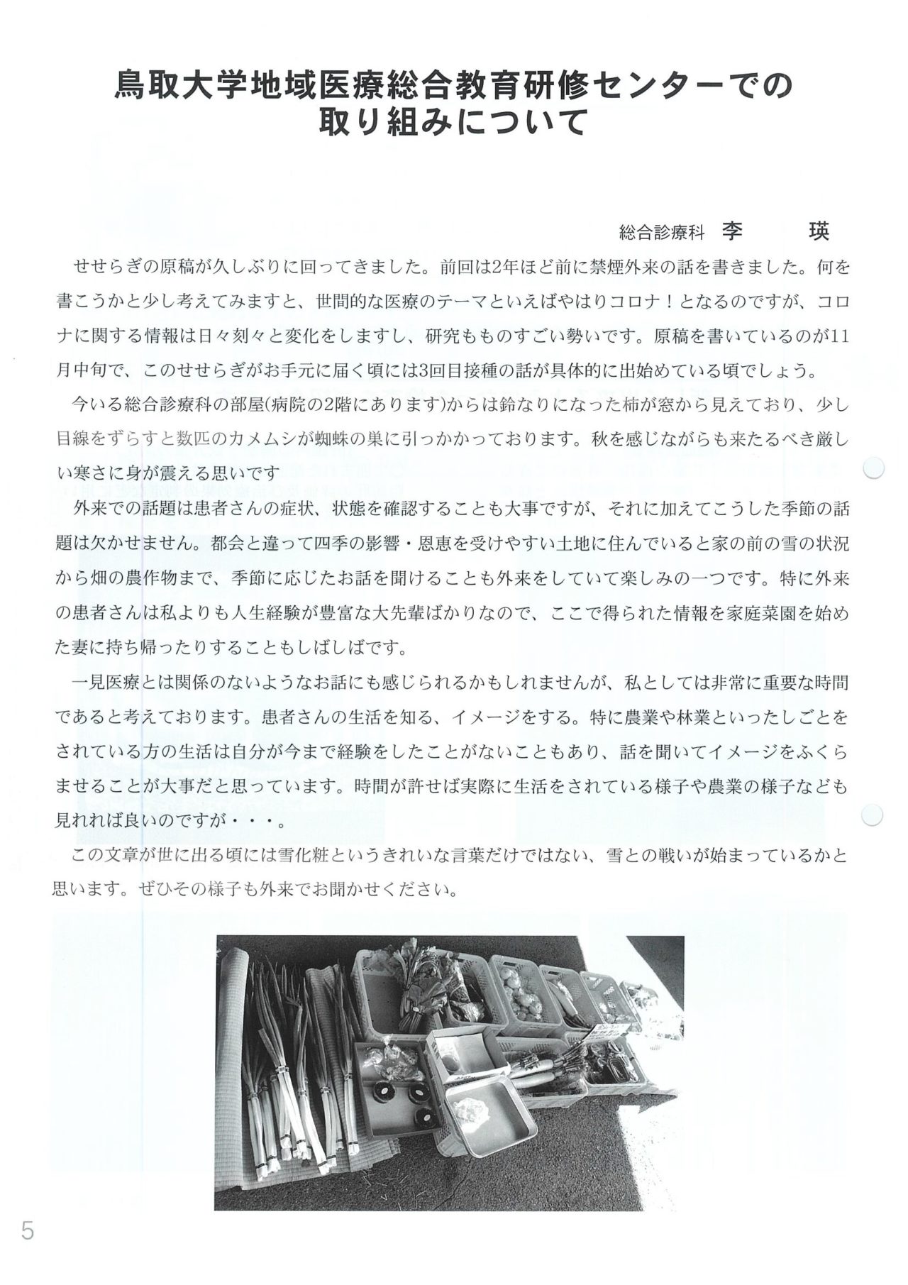 251月 2022 日野病院組合だより【せせらぎ】に掲載されました。 日野病院組合だより【せせらぎ】No73 鳥取大学地域医療総合教育研修センターでの取り組みについて 李先生の記事が掲載されました。 BY tottori-idai-main 0