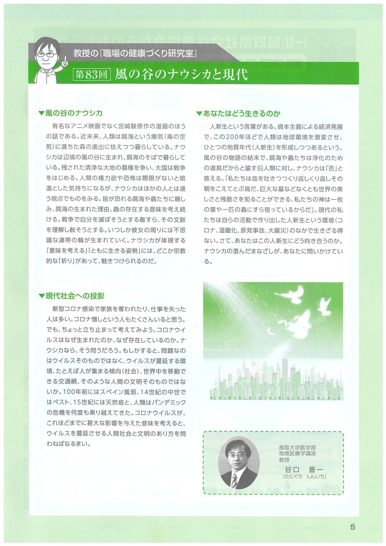 264月 2021 社会保険とっとりVOL.600 2021.4月号に掲載されました 社会保険とっとりVOL.600 2021.4月号 教授の『職場の健康づくり研究室』第83回 風の谷のナウシカと現代 BY tottori-idai-main 0