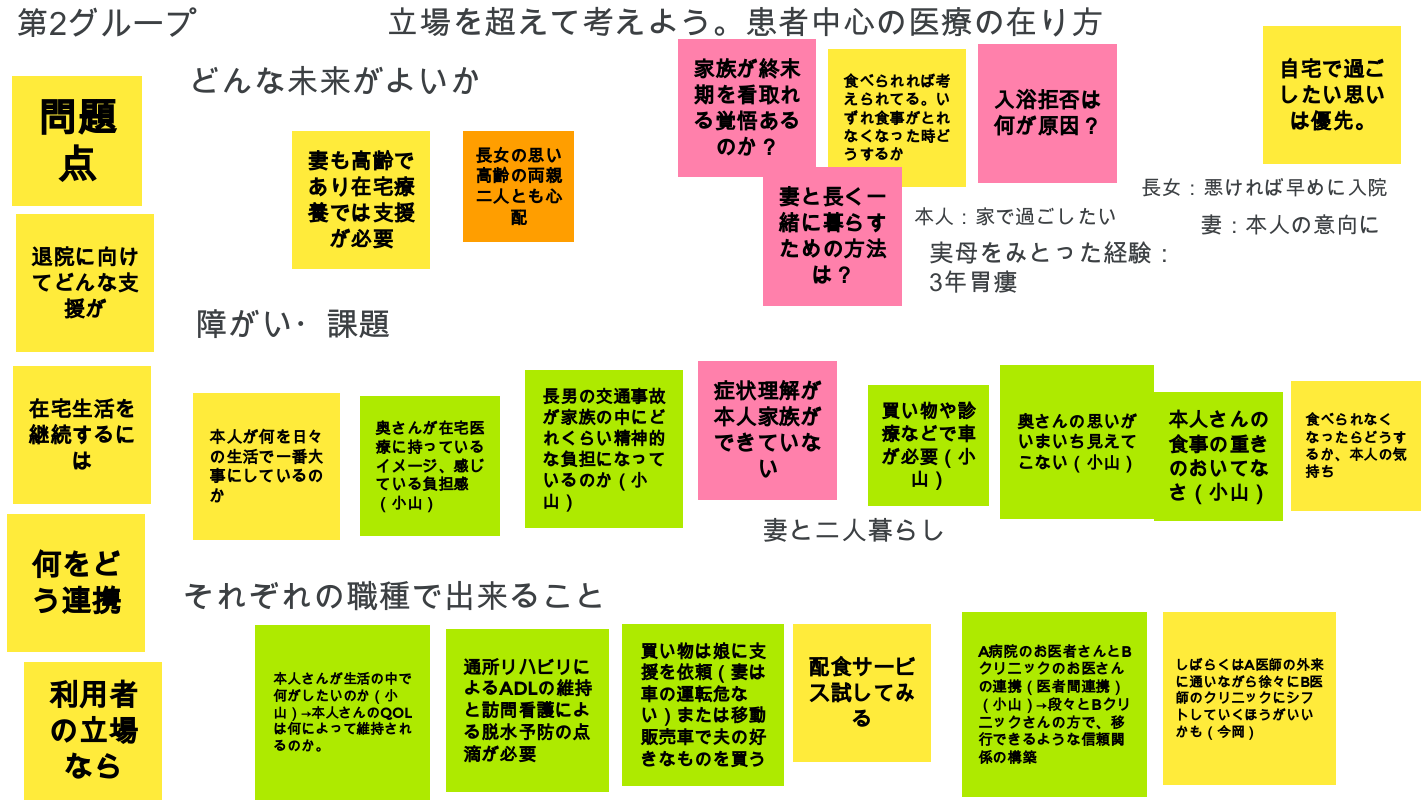 午後からは小グループに分かれて、架空の患者さんの事例を通して患者さんやその家族さんの希望をかなえていくために各々の職種が何ができるのか、ということについて話し合ってもらいました。初めて会うメンバーばかりでしたが、時間が足りなくなるような盛り上がりぶりでした。