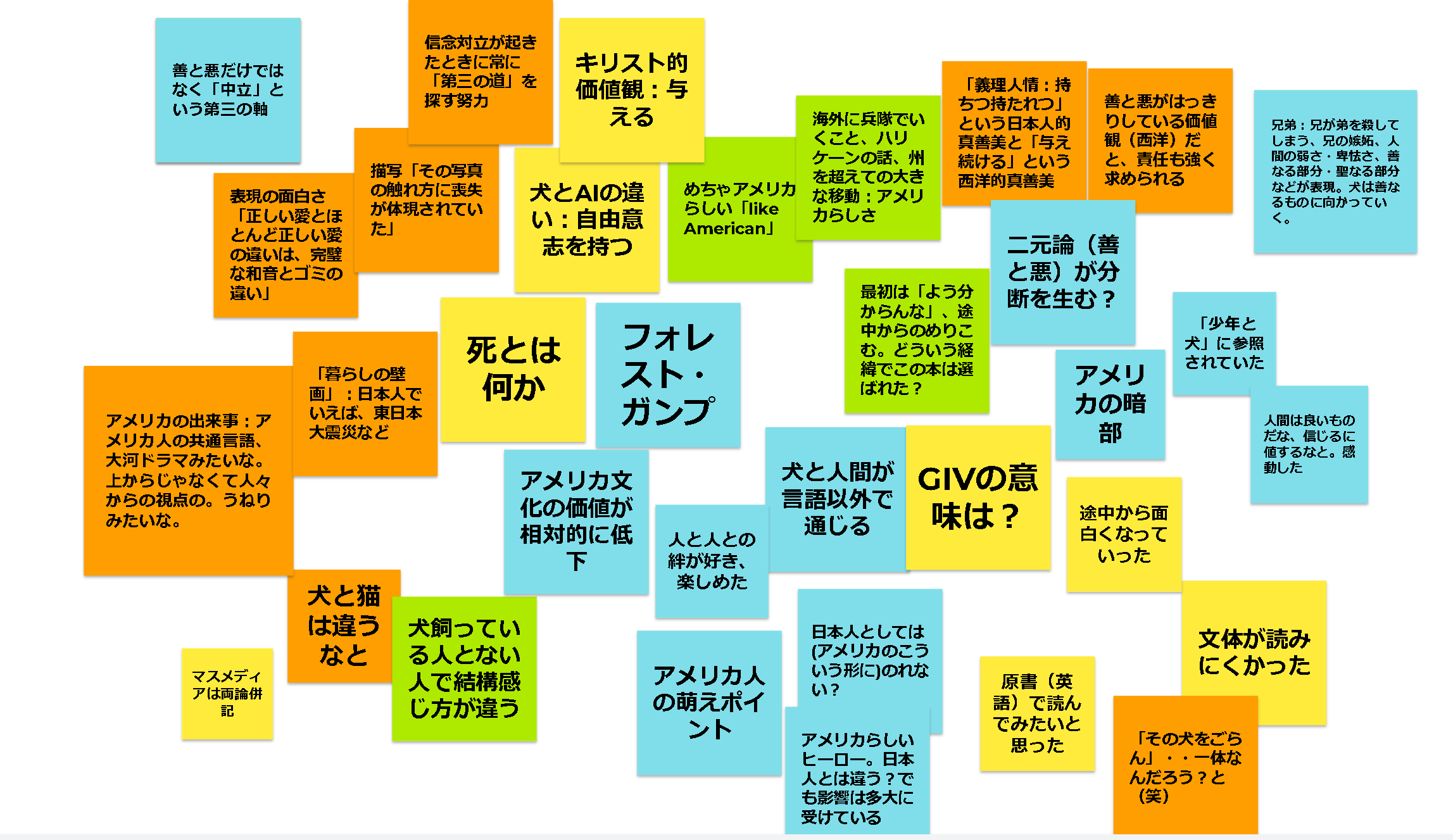 本の感想を各自述べたあと、議論はアメリカに対しての印象について移りました。各参加者のバックグランドが異なるためか、アメリカに対しての感じ方が異なるとの話題になりました。幼少期からアメリカ文化ー特に映画などに接していると、アメリカに対しての感じ方も変わるといった話題や、本書は映画のフォレスト・ガンプの現代版みたいだ、という意見も出てきました。そこから善悪・真善美・アメリカ的価値観・海と毒薬など話が多岐にわたりました。