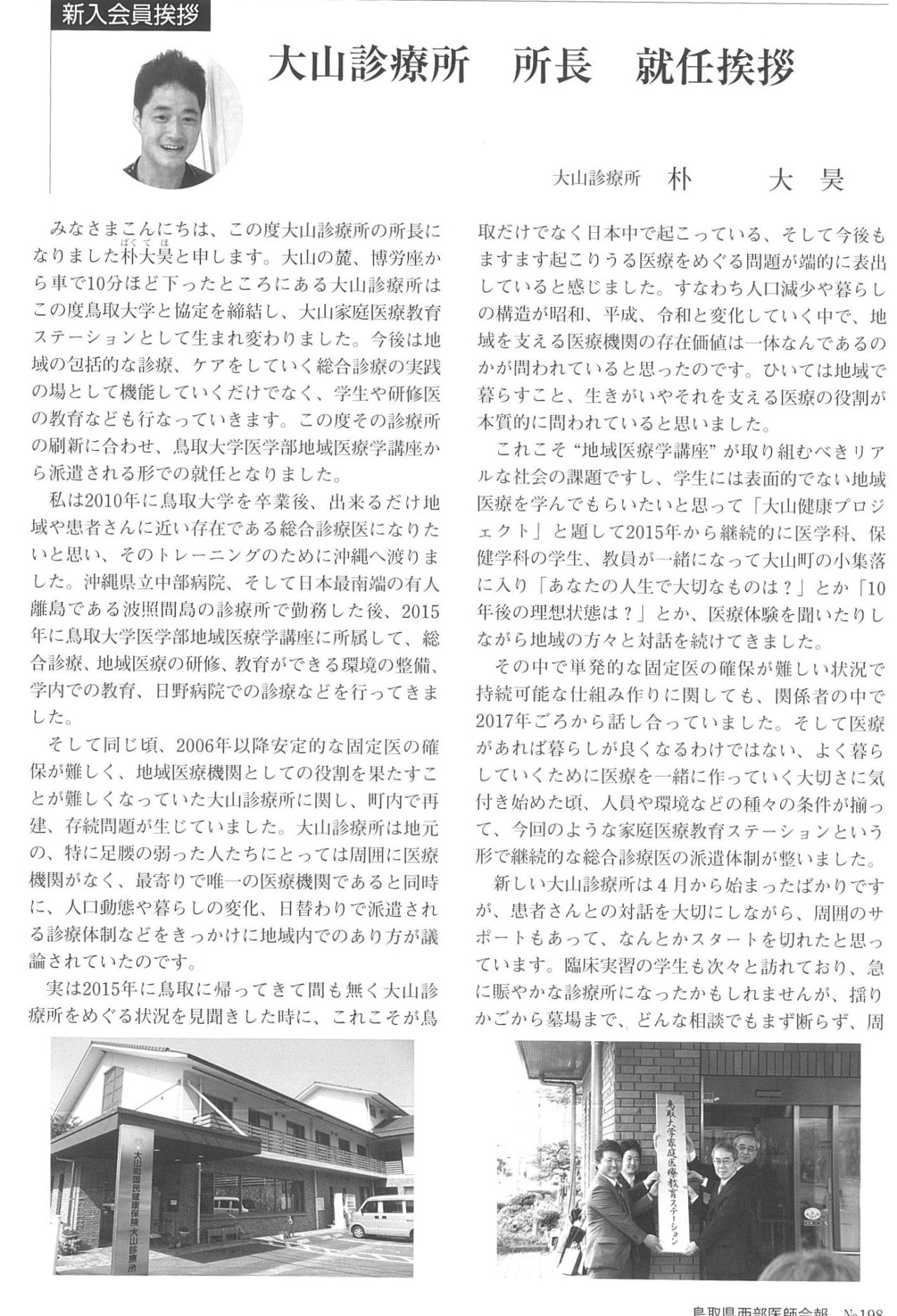 1810月 2019 鳥取県西部医師会報No.198に掲載されました 鳥取県西部医師会報No.198 P63-64 大山診療所の朴 大昊先生の新入会員挨拶が掲載されました。 BY tottori-idai-main 0