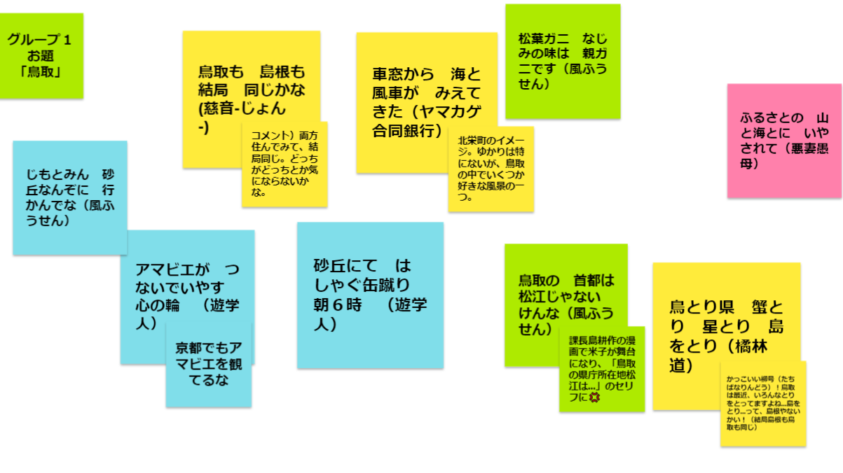 川柳deダイアローグでは,まず事前課題で作ってきた「鳥取」をお題にした川柳とペンネームを披露しました.そのあと,「キャリア」をお題にして川柳を考え,それを元に対話を行いました.川柳を通して自分のキャリアについて語ることで,より他者に伝わりやすく表現できたり,気づきがあったりしていたなあという印象でした.