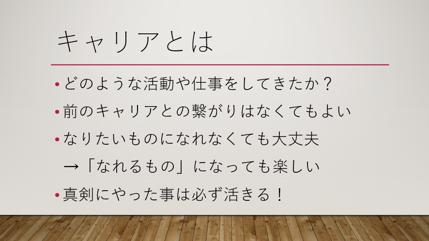 キャリア論としては、キャリアと一概にいっても静的キャリア(何になりたいか)と動的キャリア(どう生きたいか)に分類できるそうです。学校の先生と授業の準備についてやり取りをしている際に「将来やりたい職業が決まっている子も多い」とのお話で、静的キャリアについては考えられている子も多い印象だった事もあり、今回の授業では動的キャリアについて取り扱う事としました。