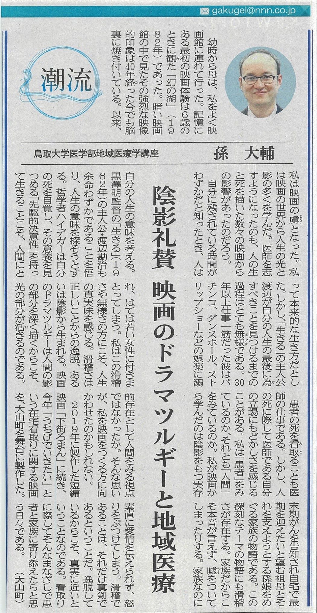 2022年3月17日 日本海新聞 潮流 9面に掲載されました。