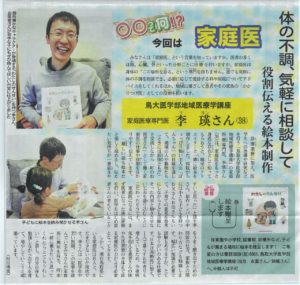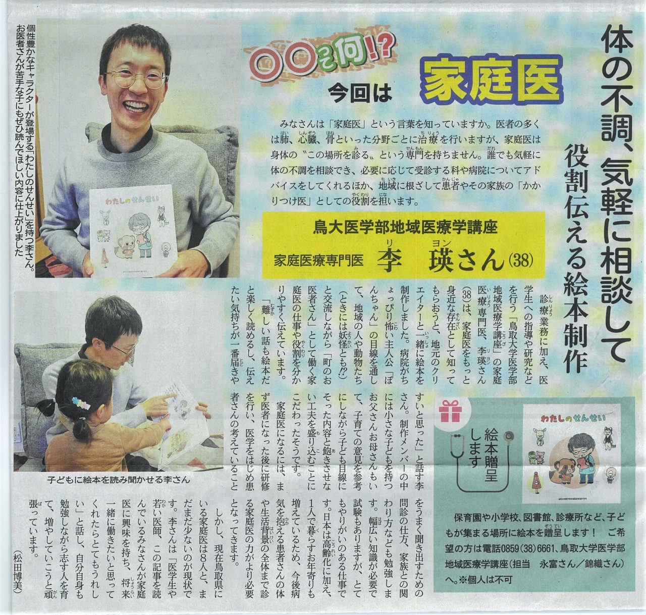 54月 2022 日本海新聞【みみちゃんプレス】に李先生が紹介されました。 2022年4月3日 日本海新聞【みみちゃんプレス】1面にて 『家庭医療専門医』として李先生が掲載されました。 ※「みみちゃんプレス」とは、第1、3日曜に別刷り特集号で、小学生を主な対象として、分かりやすいニュース解説や学習に役立つ記事を掲載しています。 BY tottori-idai-main 0