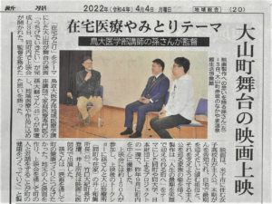 64月 2022 『うちげでいきたい』上映会が日本海新聞に掲載されました。 2022年4月4日 日本海新聞 20面 4月3日に大山町で行われた、在宅みとりをテーマとした映画『うちげでいきたい』上映会の様子が紹介されました。 BY tottori-idai-main 0
