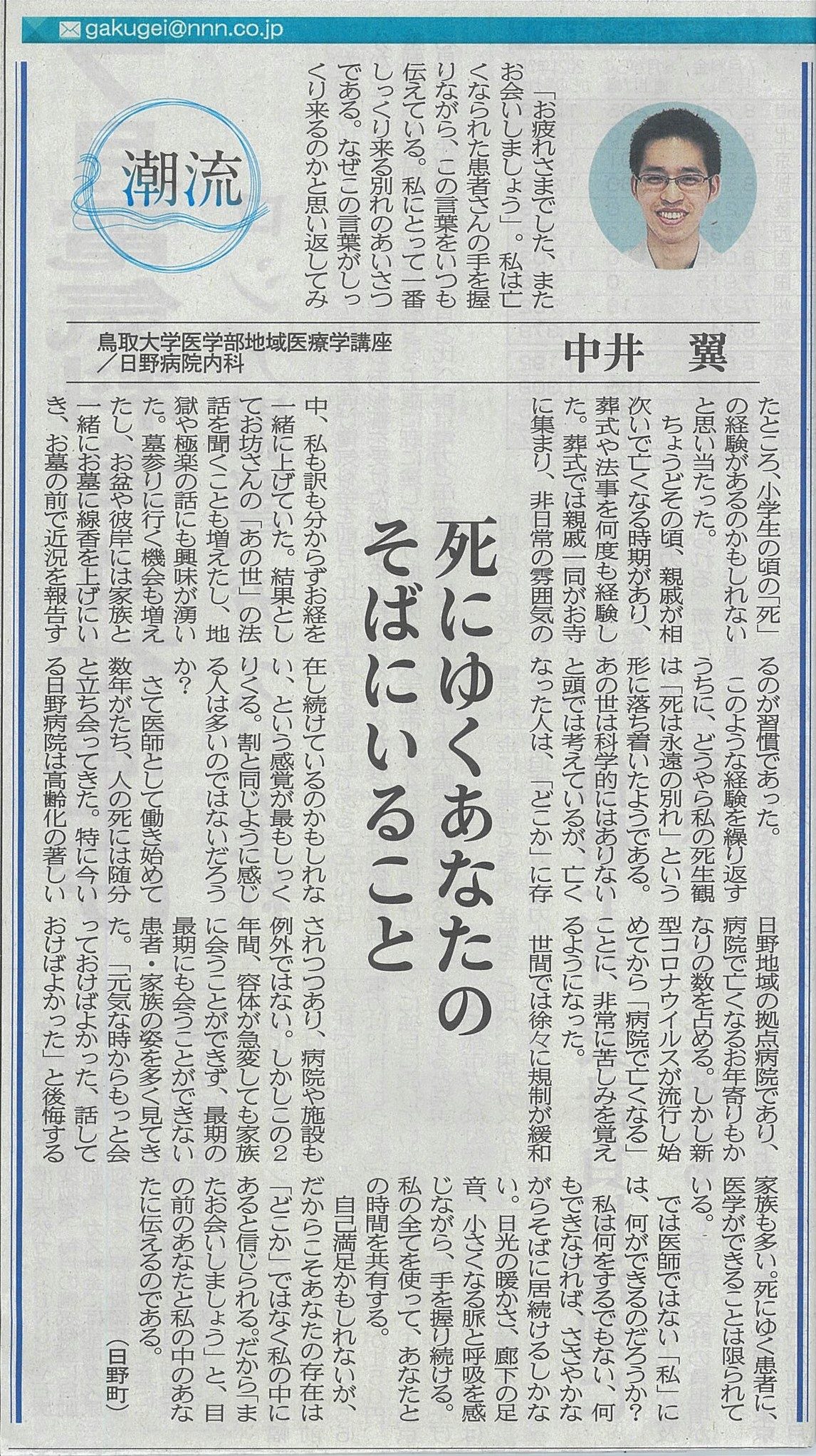 Hey Buddy!, I found this information for you: "日本海新聞【潮流】に掲載されました". Here is the website link: https://cbfm.med.tottori-u.ac.jp/blog/20220522nakai/. Thank you.