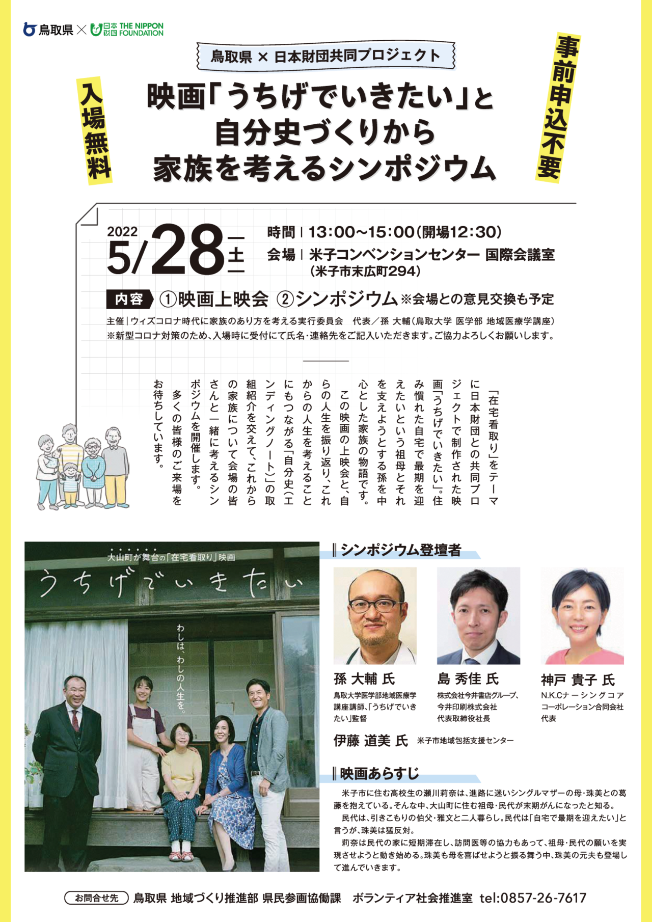 245月 2022 『うちげでいきたい』上映会&シンポジウム開催のお知らせ 今週末、5月28日(土)13時より、米子コンベンションセンターにて映画「うちげでいきたい」と エンディングノート(自分史)づくりに関するシンポジウムが開催されます。 入場無料、事前申込不要です。 当講座の孫大輔講師がシンポジウムに登壇いたします。奮ってご参加ください。 BY tottori-idai-main 0