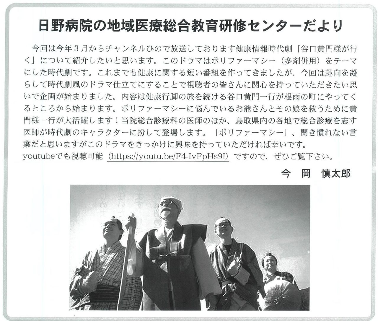 265月 2022 日野病院組合だより『せせらぎ』に掲載されました 日野病院組合だより『せせらぎ』に今岡先生の記事が掲載されています。 ~日野病院の地域医療総合教育研修だより~ BY tottori-idai-main 0