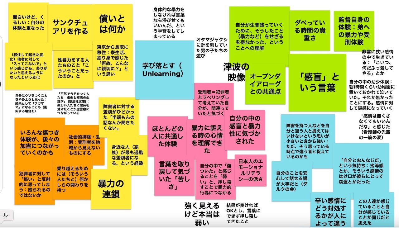 読書会でも注目されていたワードとして、感盲、暴力、償い、サンクチュアリ、アンラーニングがあった。参加したみんな、自分の中の感盲(自分の感情にふたをしてしまうこと)、暴力性と、登場人物の感情を照らし合わせていた。暴力によって傷ついた経験を吐露する人もいた。