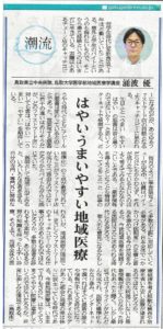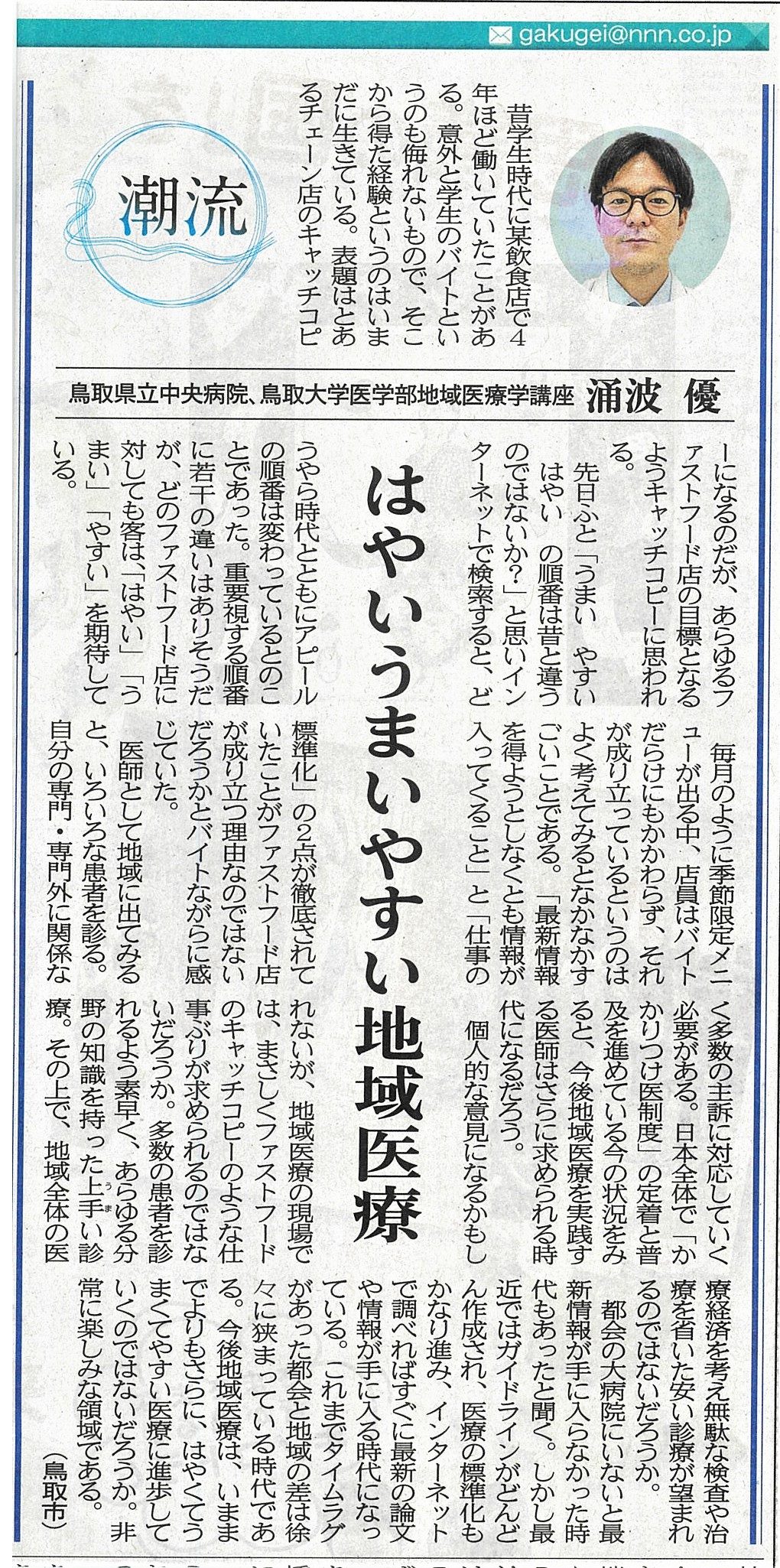 206月 2022 日本海新聞【潮流】に掲載されました。 2022年6月19日 日本海新聞 潮流 9面に掲載されました。 鳥取県立中央病院 涌波 優先生 『はやいうまいやすい地域医療』 BY tottori-idai-main 0
