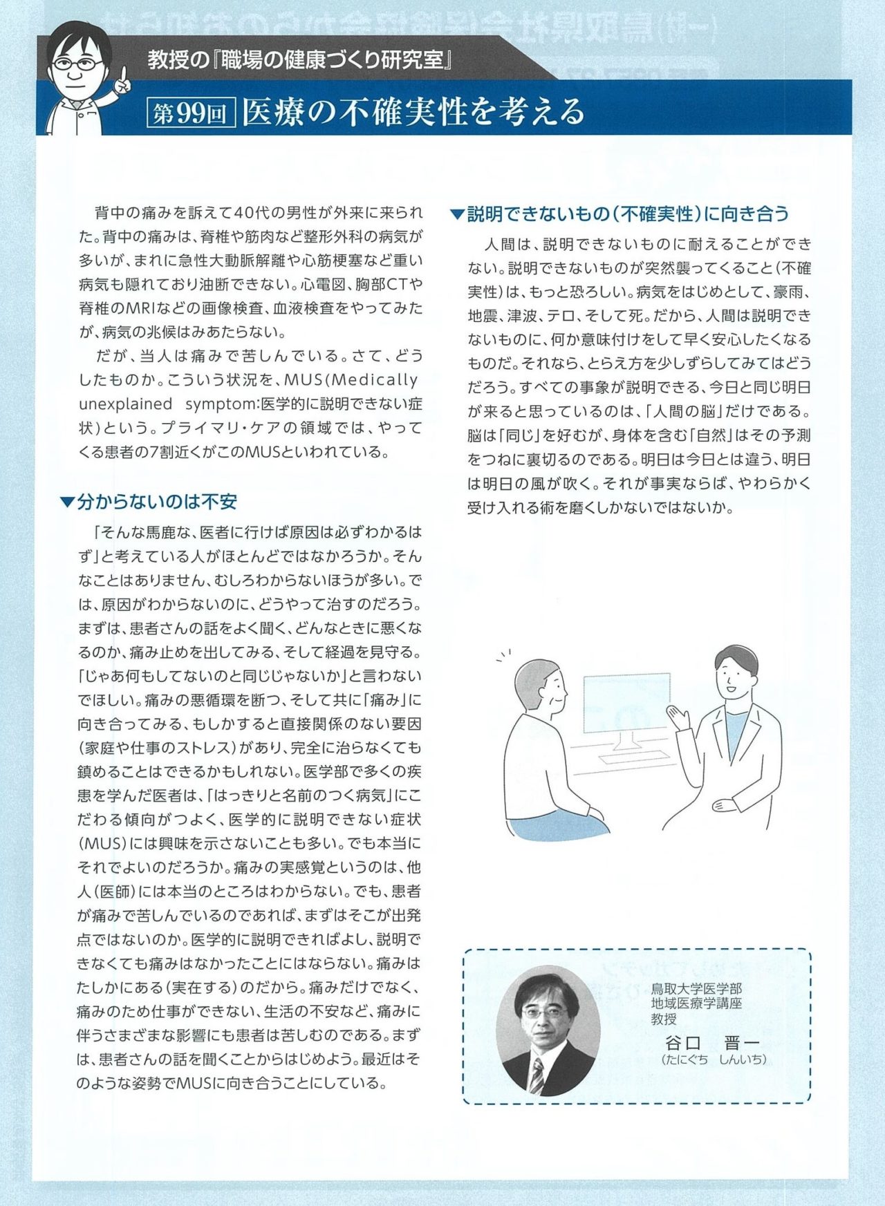 318月 2022 「社会保険とっとり」に掲載されました。 社会保険とっとり vol.616 2022年8月号 教授の『職場の健康づくり研究室』 第99回 医療の不確実性を考える BY tottori-idai-main 0