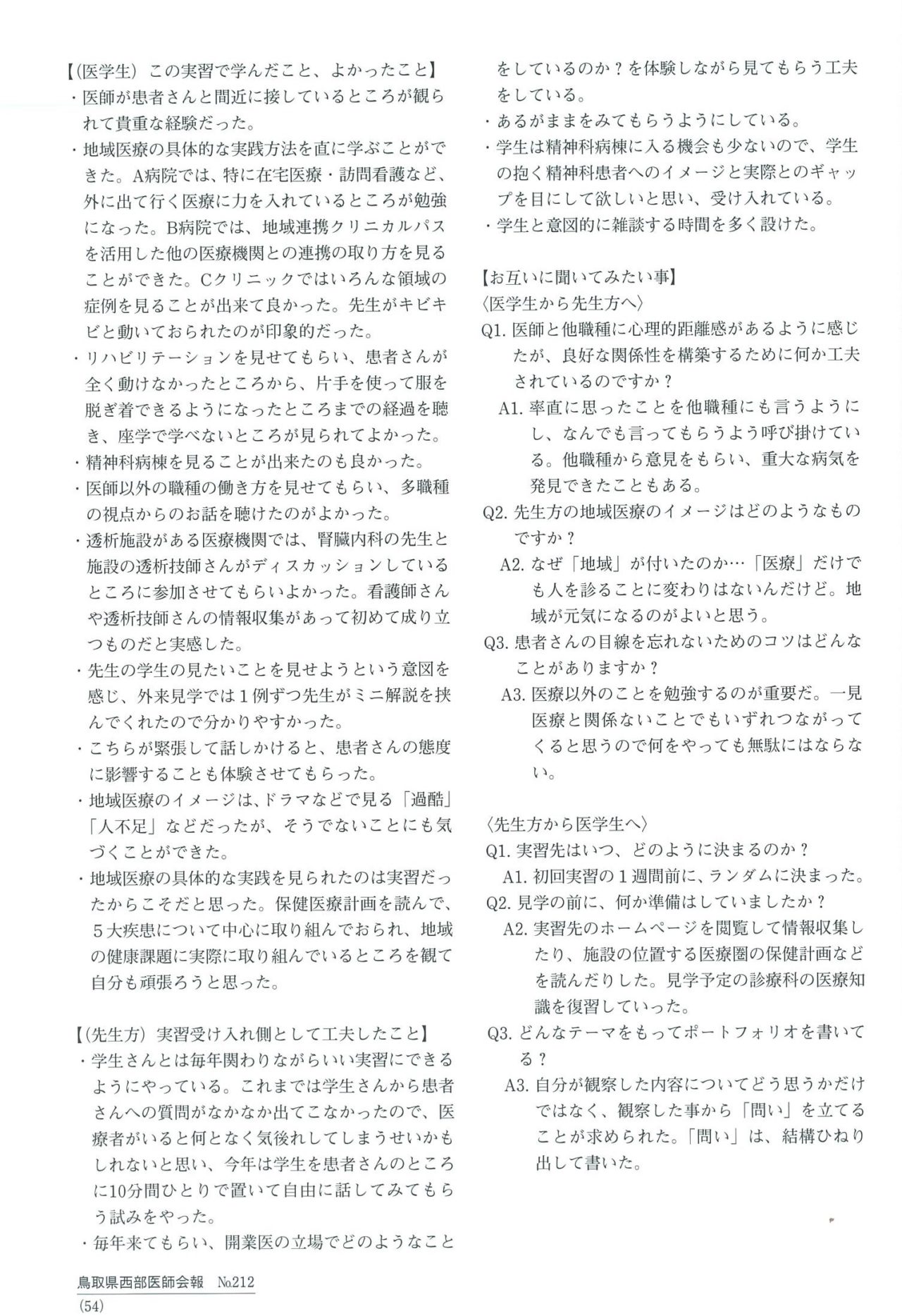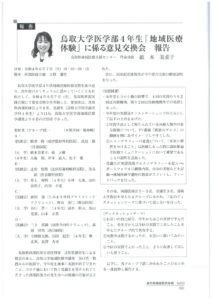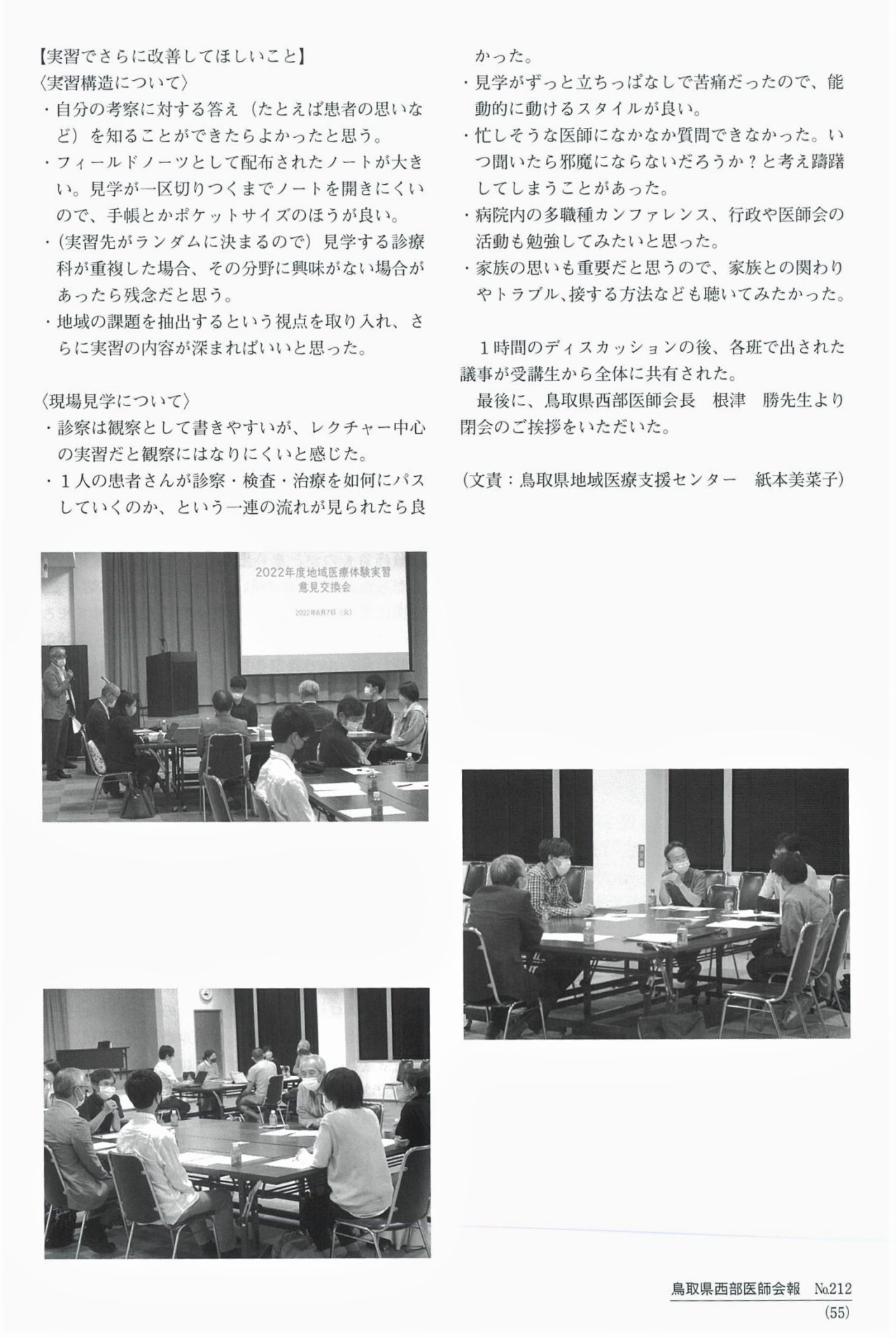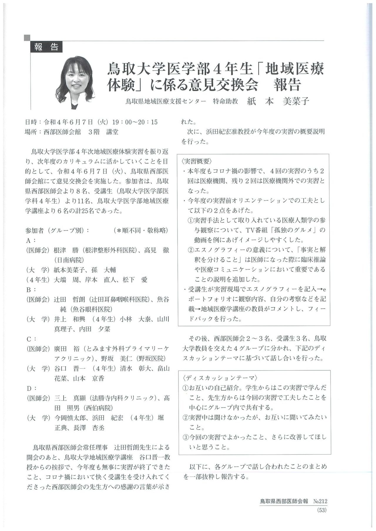 229月 2022 鳥取県西部医師会報 No.212に掲載されました。【地域医療体験に係る意見交換会 報告】 鳥取県西部医師会報 No.212 鳥取大学医学部4年生「地域医療体験実習」に係る意見交換会 紙本先生の報告記事が掲載されました。 BY tottori-idai-main 0