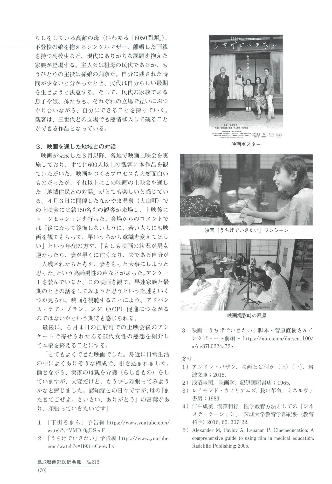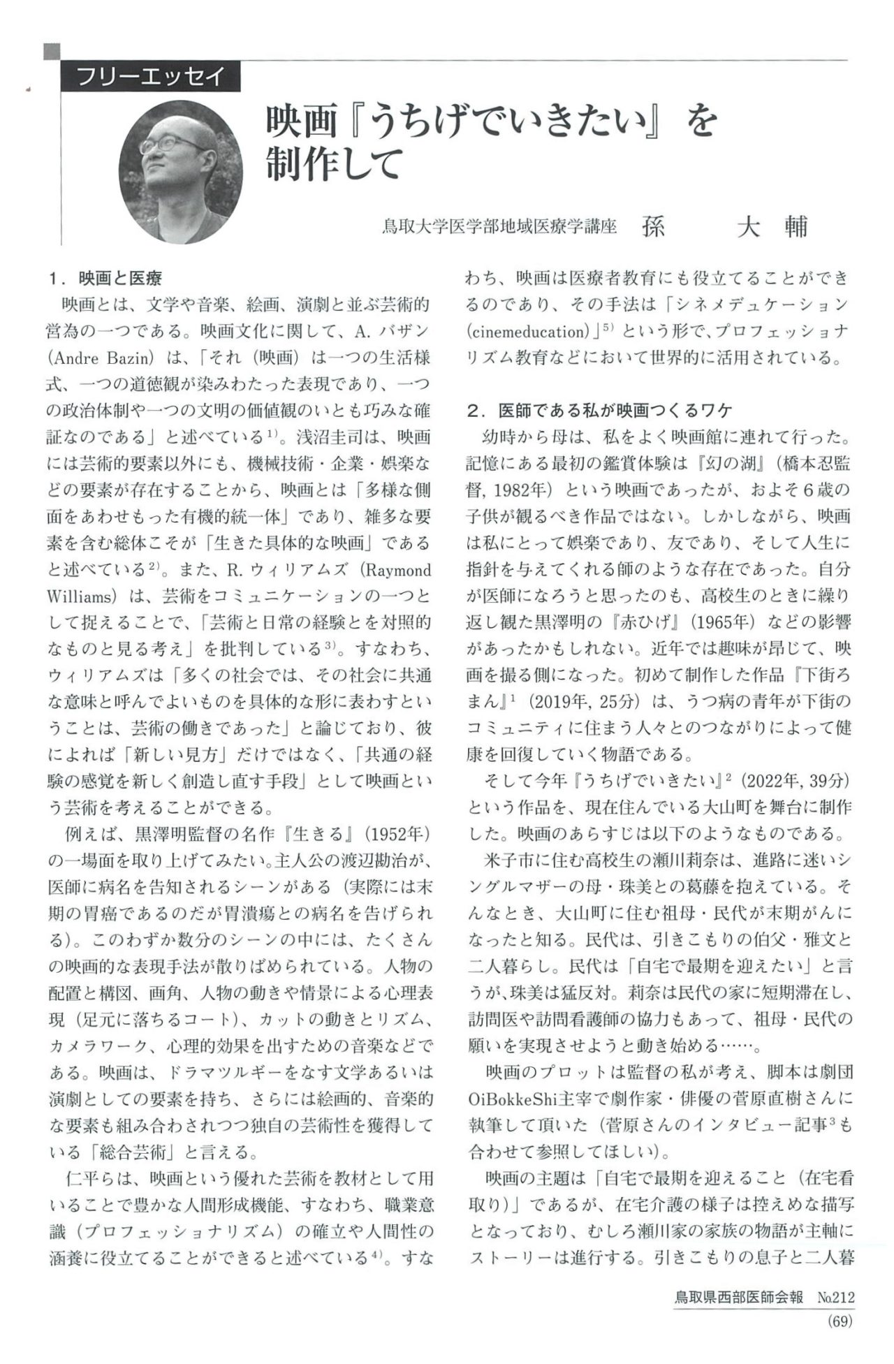 239月 2022 鳥取県西部医師会報 No212に掲載されました。【フリーエッセイ】 鳥取県西部医師会報 No212 孫先生の記事が掲載されました。 【フリーエッセイ】映画『うちげでいきたい』を制作して BY tottori-idai-main 0