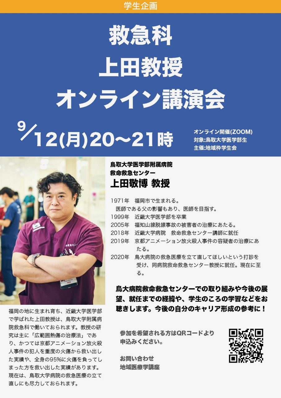 9月12日に鳥大病院救急科上田敬博教授のオンライン講演会を開催しました。救命救急センターにおける現在の取り組みや今後の展望、学生の頃の話などを語ってもらいました。参加者は地域枠学生・教員など20名以上でした。
