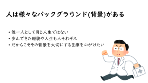 医療現場ではついつい、高血圧の患者さん、糖尿病の高齢女性、というふうなラベリングをして診察をしがちですが、一人ひとりの人生には様々な物語や背景があり、そうしたバックグラウンドを大切にしていきたい、と改めて感じた次第です。