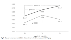 図1. 2018年度と2019年度のジェファソン共感尺度スコア平均の変化