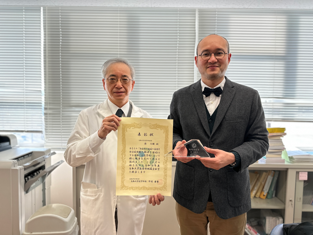 84月 2023 孫講師が地域貢献賞を受賞しました 孫講師が2022年度鳥取大学医学部・地域貢献賞を受賞し、3月2日に米子コンベンションセンターにて授賞式がおこなわれました。大山町での社会的処方事業、地域をベースにした映画製作プロジェクトなどの業績が評価されました。 BY tottori-idai-main 0