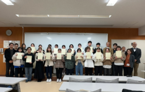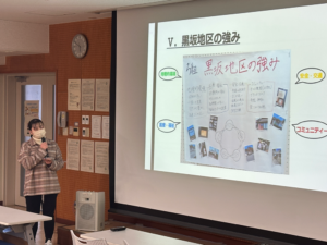 104月 2023 くろさか春夏秋冬セミナー修了式をおこないました 3月3日の夕方に、くろさか春夏秋冬セミナー修了式をおこないました。三学科(鳥大医学科・保健学科とYMCAリハビリ科)の学生がチームごとに、年間を通して学んだことの発表をおこない、最後に谷口教授から修了証を手渡しました。 学生さんは皆、主体的に地域でのフィールドワークを通して、多くのことを学んでくれたようです。来年度は大山町でのフィールドワークを予定しています。 BY tottori-idai-main 0