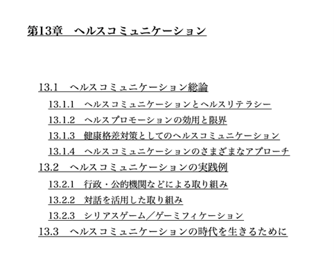 第13章「ヘルスコミュニケーション」では、総論としてヘルスコミュニケーション、ヘルスリテラシー、健康格差対策などを論じ、実践例としてマーケティング理論に基づいたアプローチや、対話カフェ、シリアスゲームなどを紹介しています。